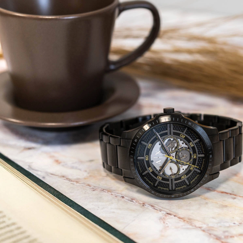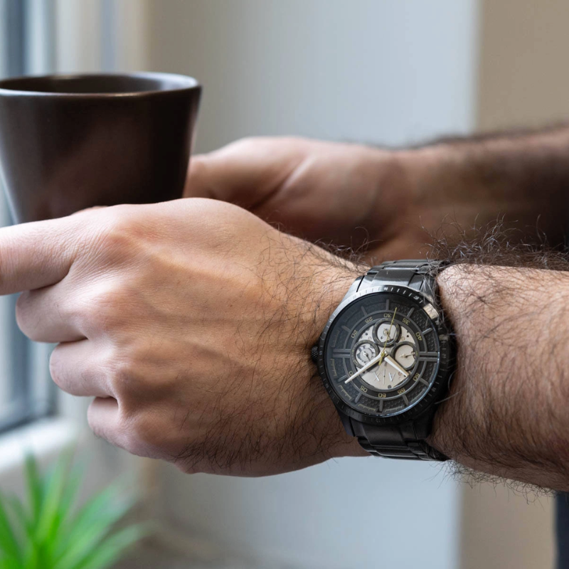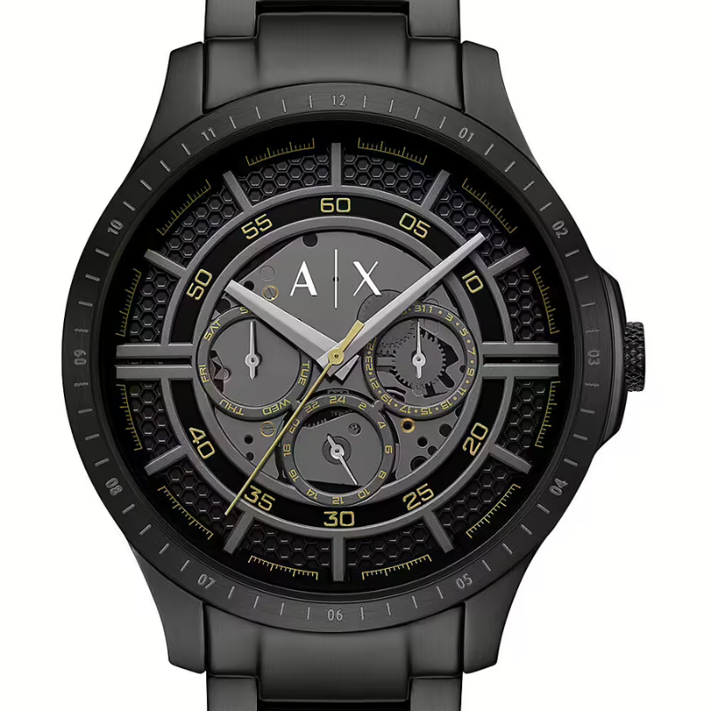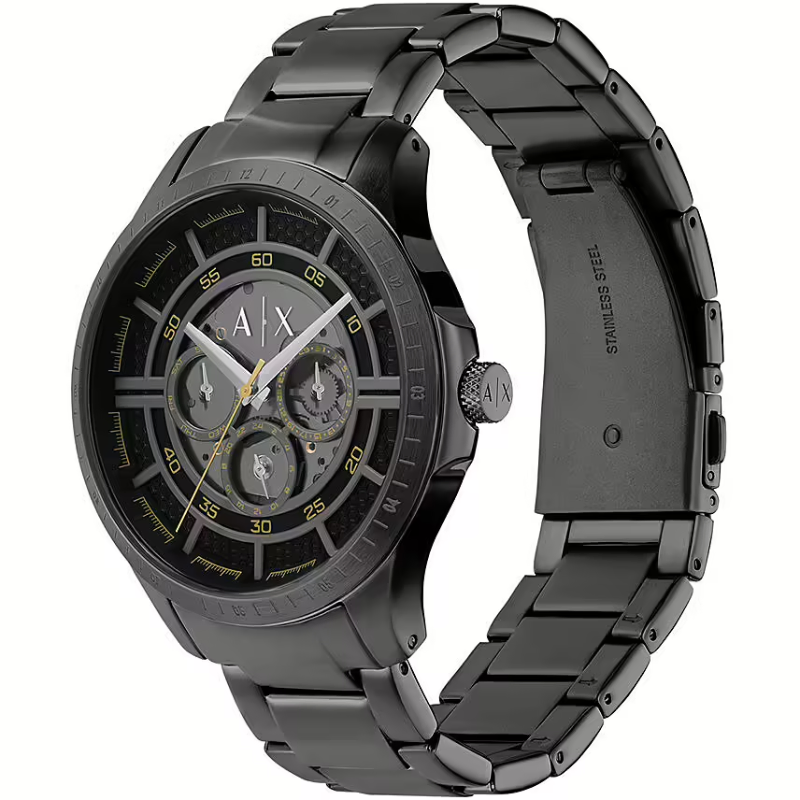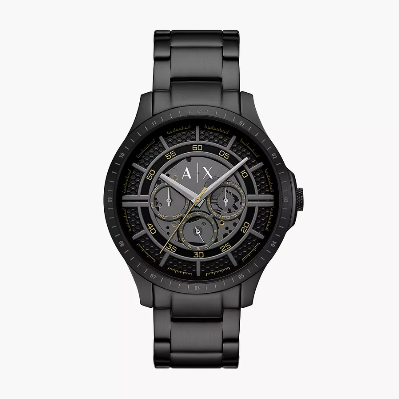 The Armani ExchangeAX2460 is a bold black chronograph watch featuring a multi-layered dial, matte black stainless steel bracelet, and gold-tone accents for a striking modern look. Designed for style and performance, this timepiece offers precise quartz movement multi-function sub dials, and durable construction—making it the perfect choice for men who want a sleek, contemporary watch that stands out.