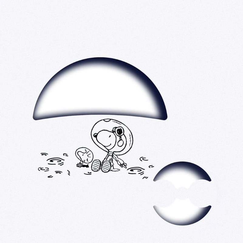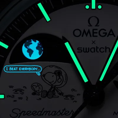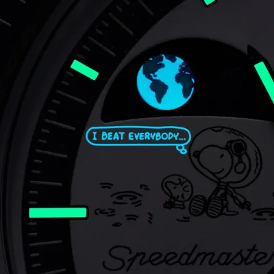 Beneath the earthphase indicator is an illustration of Snoopy and Woodstock in full space geargazing at Earth from the Moon. A hidden phrase, revealed only under UV light,nods to the pioneering spirit of the Moonwatch model and those who dare toimagine things differently.