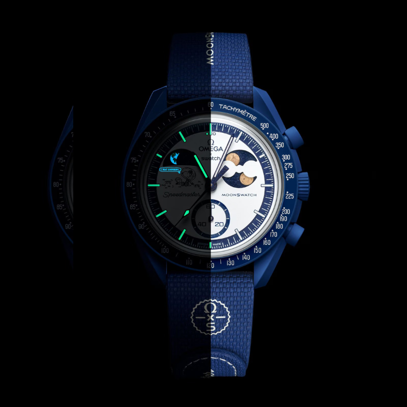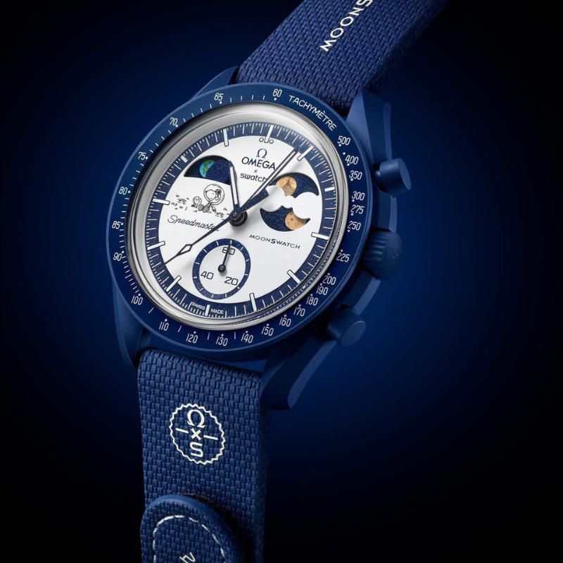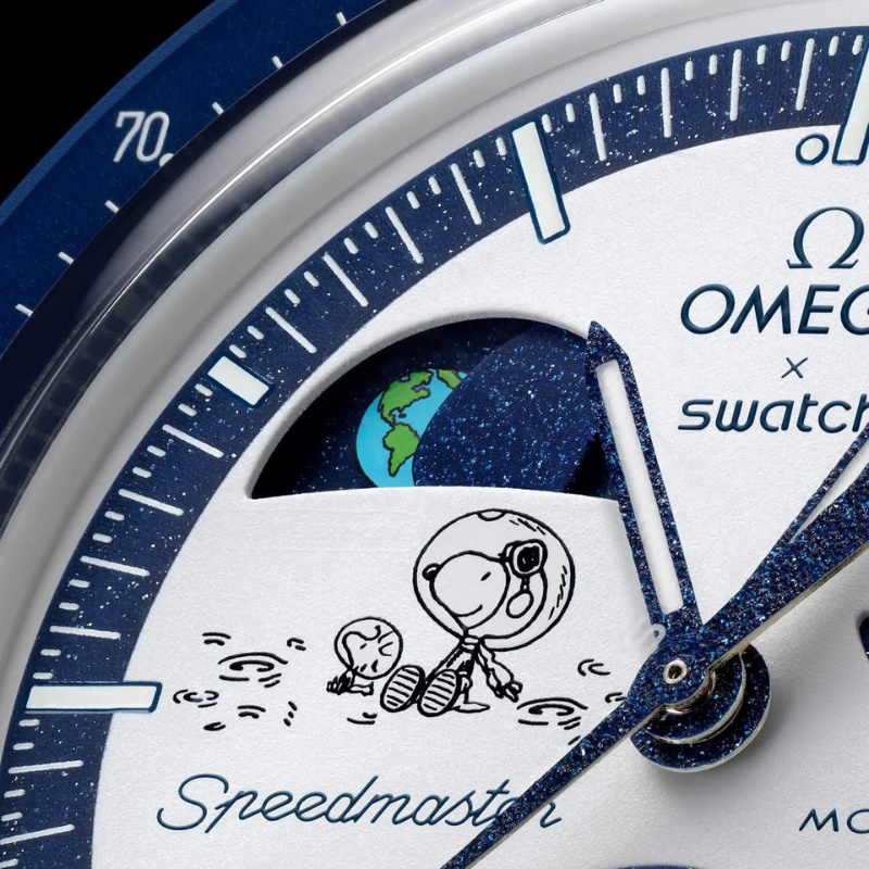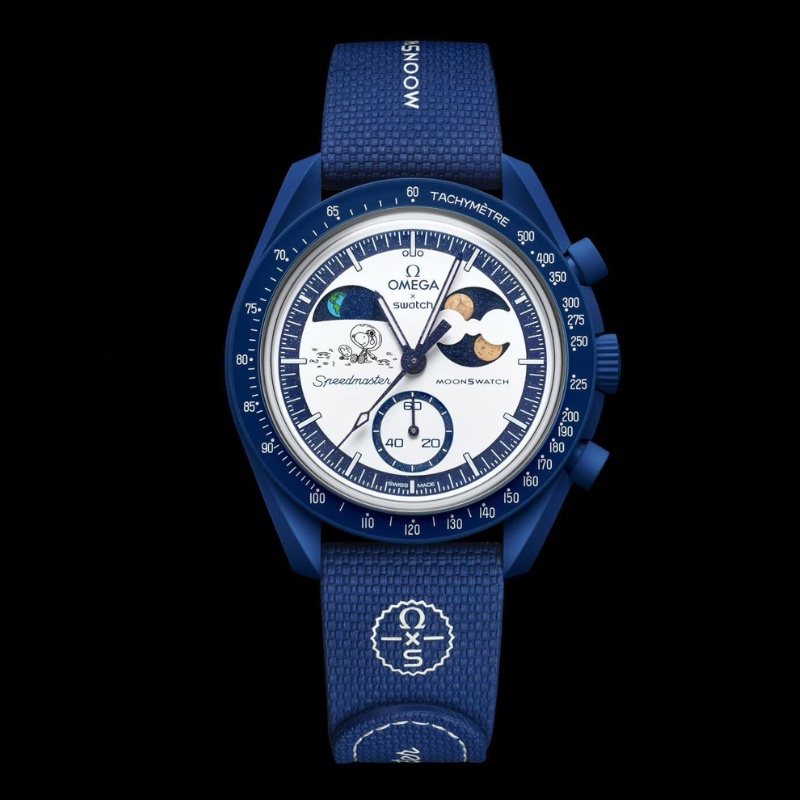 This uniquechronograph features a navy Bioceramic case, crown, and pushers with a matchingnavy rubber strap. The white opaline dial includes luminous hour markers andhands (Grade A Super-LumiNova®). At 10 o’clock, an Earth phase indicator glowsblue under UV light, with Snoopy & Woodstock marveling from the Moon. The 2o’clock subdial showcases twin Moon phases in Moonshine™ Gold — one inspired bySnoopy’s world, the other nodding to the Sturgeon Moon.