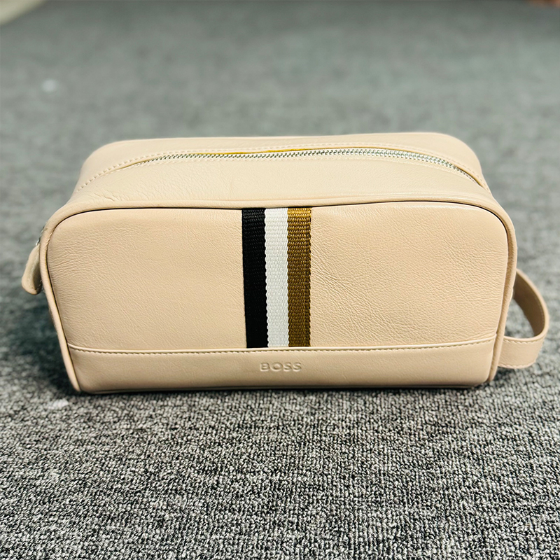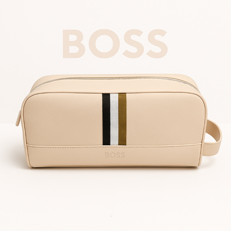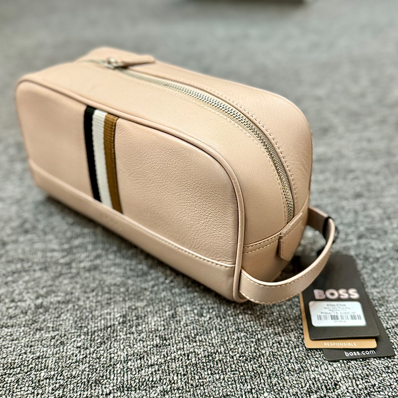 Upgrade your travel routine with the BOSS First Class Wash Bag in chic pink. Crafted from premium, durable materials, it features a roomy main compartment alongside smart interior and exterior pockets, polished metal zippers, and subtle designer detailing. This stylish toiletry bag adds a modern and elegant twist to your grooming essentials.