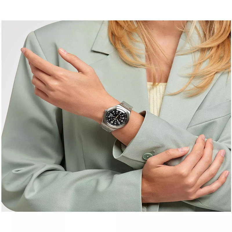 height. The black dial adds a touch of elegance, while the plexiglass crystal