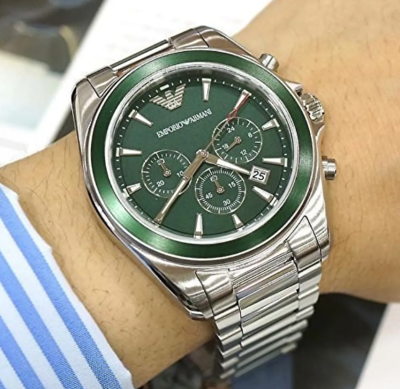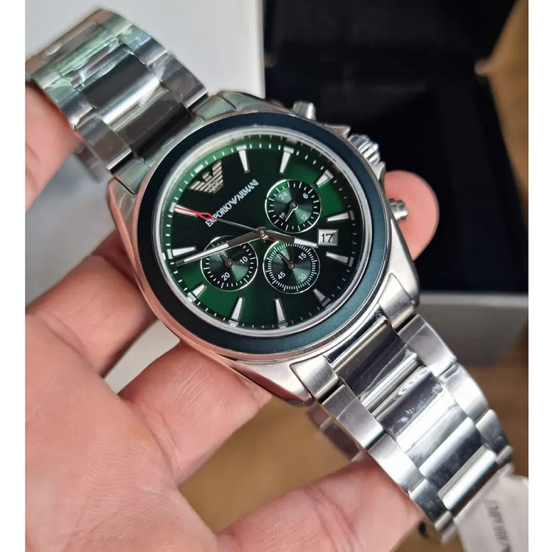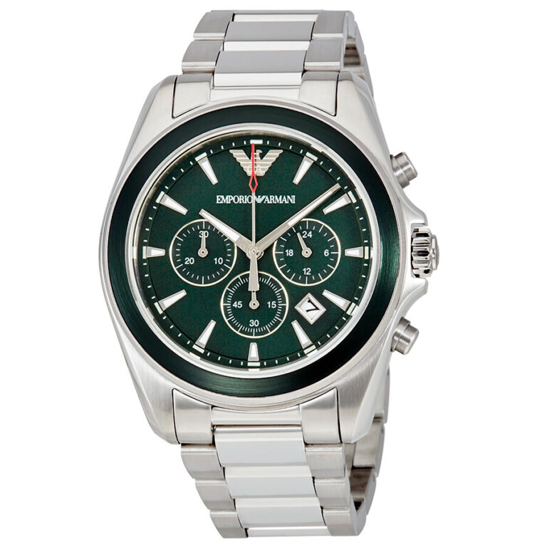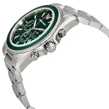 Stainlesssteel case with a stainless steel bracelet. Fixed stainless steel bezel with agreen top ring. Dark green dial with luminous silver-tone hands and index hourmarkers.
