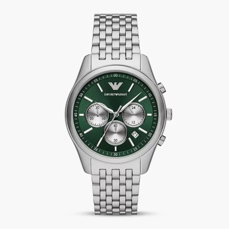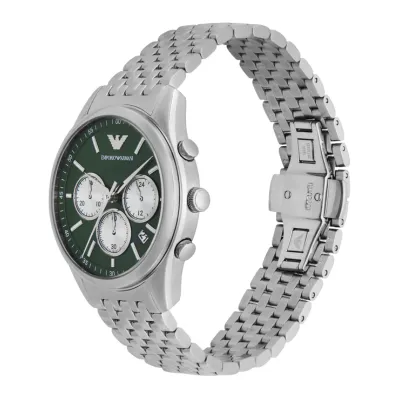 TheEmporio Armani Antonio Chronograph Green Dial Men's Watch (Model AR11581) is asleek and stylish accessory, perfect for both casual and formal wear. Itfeatures a 41mm round stainless steel case with a bold green dial, offering astriking contrast against the silver-tone accents. With a case thickness of12mm, the watch maintains a modern and slim profile. The fixed silver-tonestainless steel bezel complements the stainless steel bracelet, which is 20mmwide and secured by a deployment clasp with a push button release for ease andsecurity. Powered by reliable Japan Quartz movement, this chronograph watchoffers precise hour, minute, and second functions. The solid case back ensuresdurability, while the scratch-resistant mineral crystal protects the dial fromeveryday wear. The pull/push crown allows for simple adjustments, and with awater resistance of up to 50 meters (165 feet), it is suitable for light waterexposure. Stylish and functional.