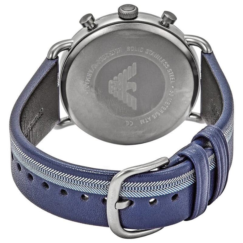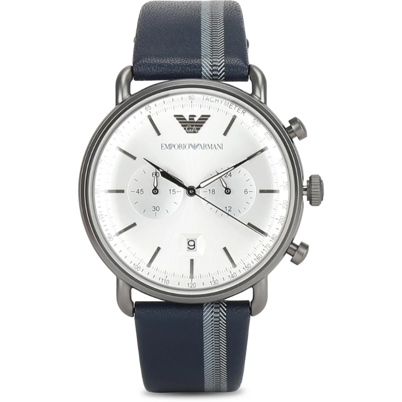 Stainless steel case with a blue leather strap. Fixedstainless steel bezel. Silver sunray dial with luminous grey hands and indexhour markers. Minute markers. Tachymeter markings around the outer rim. TheEmporio Armani Eagle appears at the 12 o'clock position. Dial Type: Analog.Luminescent hands. Date display at the 6 o'clock position. Chronograph - twosub-dials displaying: e
