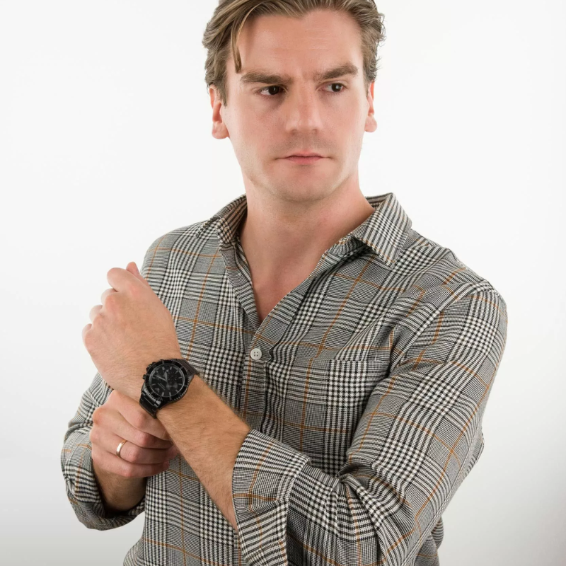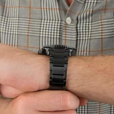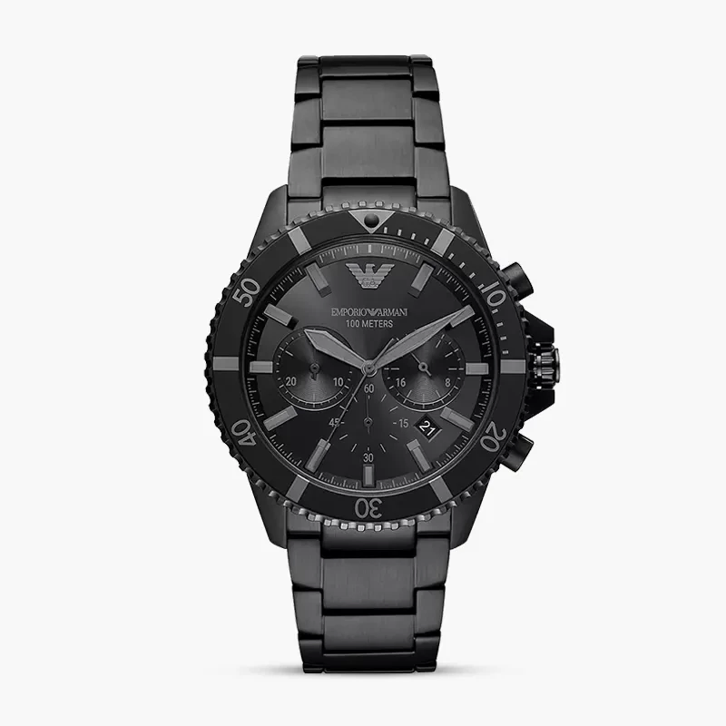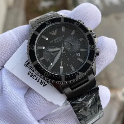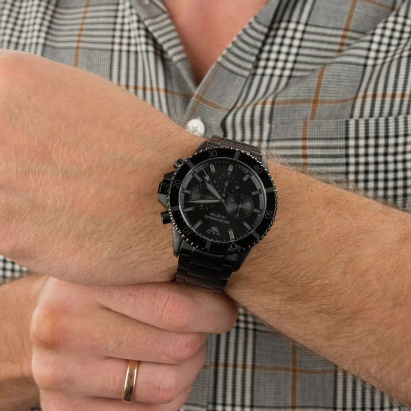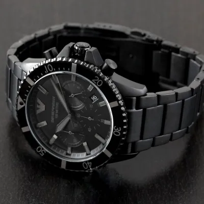 Carry greattechnology wrapped around your wrist with this stylish men analog watch fromEmporio Armani. Functional on a quartz movement and protected by a mineralglass, the black round dial is housed in a case. It displays chronograph, and acrown for time adjustment. The strap exudes a black hue that accentuates thelook of the watch. Besides, it is completed with a fold-over clasp with doublepush button safety clasp that ensures a secure fit on the wrist.