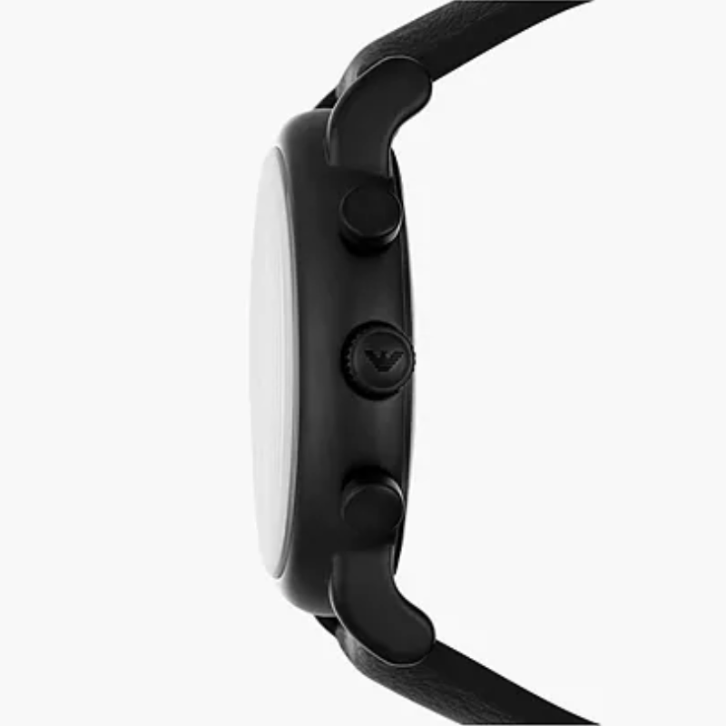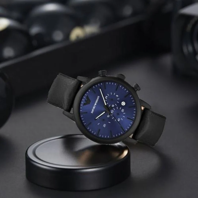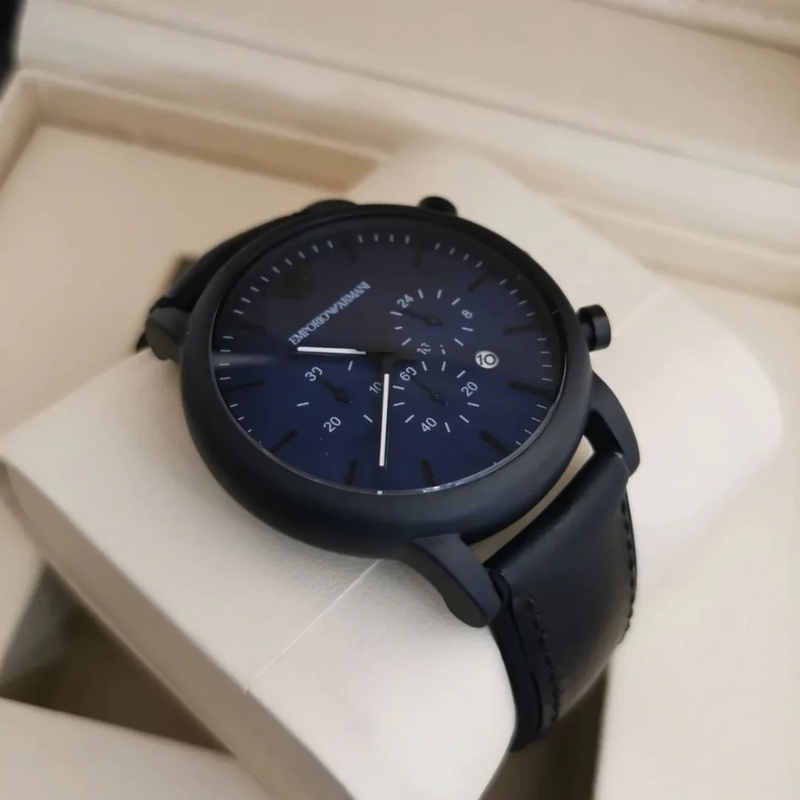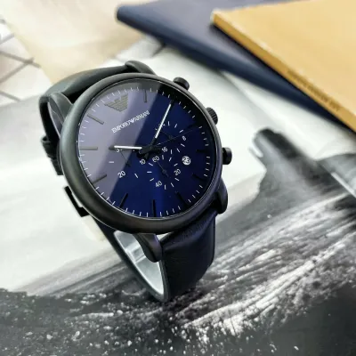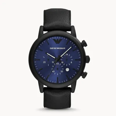 An embodiment of Emporio Armani's classic aesthetic thisbold, clean-cut chronograph timepiece is understated yet riveting. A beautifulmarriage of textures this timepiece features a 46 mm navy sunray dial withblack stick indexes, white hands and a date window and a black leather strap. This46mm Emporio Armani watch features a blue dial with black stick indexes,chronograph movement and black leather strap