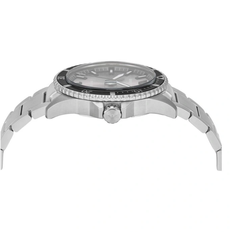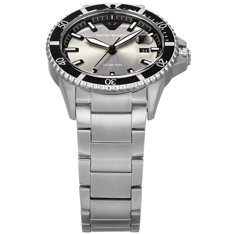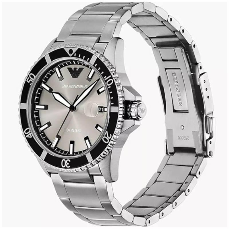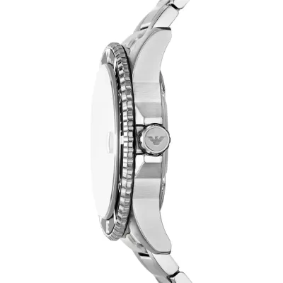Emporio Armani's 42mm World Explorer watch features a refinedgray-toned beige sunray dial, three-hand date movement, and a stainless steelbracelet. Elevated design details like luminous accents on the hands, indexes,and bezel markings, and a magnifying window over the date at 3 o'clock,combined with the sport-driven design aesthetic, make this watch perfect forany occasion.