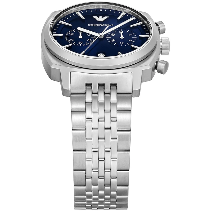 The Emporio Armani Ruggero AR11688 men's watch is a fashionable model with a contemporary look. Silver-tone stainless steel is used to make both the envelope and the bracelet, resulting in a unified and sophisticated piece. Everyday use is made more functional by the dial's linear indexes and date of the days of the month. The watch's dial is shielded by mineral glass, and a quartz mechanism powers it. A50-meter water resistance provides defense against splashes from rain and handwashing.