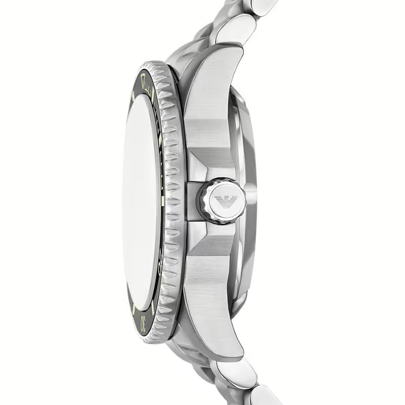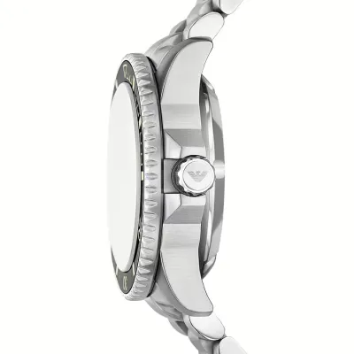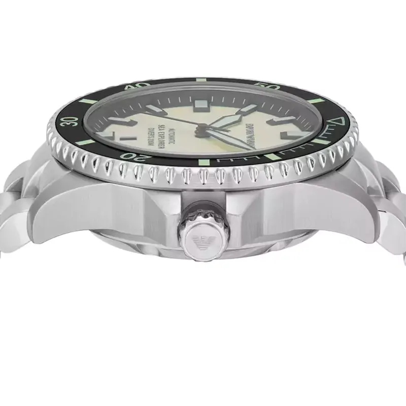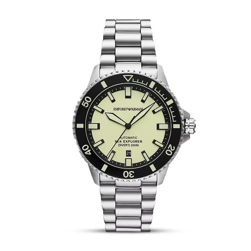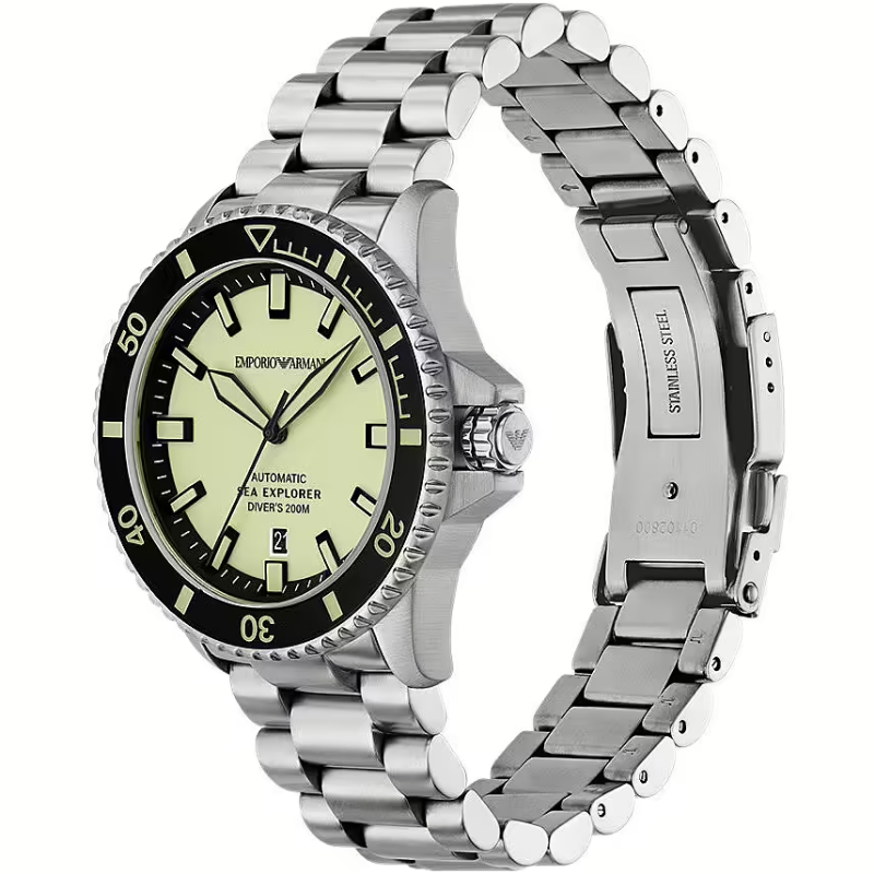 Emporio Armani's SeaExplorer is a 42.5mm watch with a light yellow Super-LumiNova® dial, as well ashands, indexes and bezel markings, for optimal visibility in dark underwaterconditions. The Sea Explorer features an automatic three-hand date movement,sapphire crystal, a screw-down crown, and a stainless steel bracelet. The"Diver's" marking on the dial asserts that this is an ISO 6425Certified watch with 20 ATM water resistance.