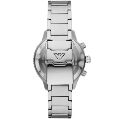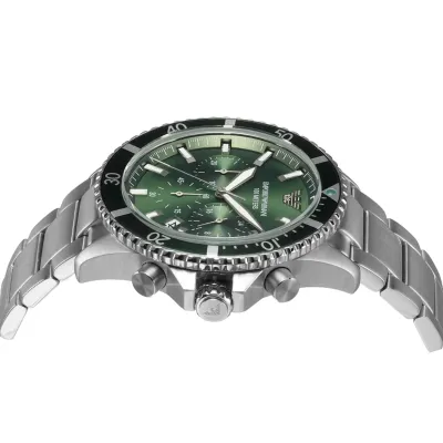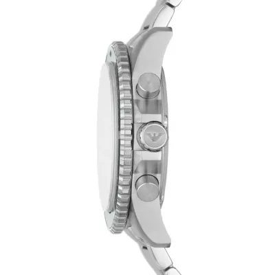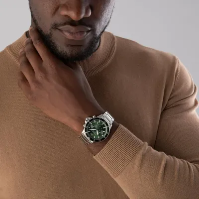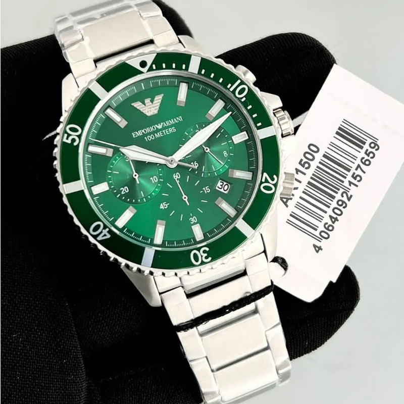 Emporio Armani's 43.5mm World Explorer watch features a green cd finish, sunray dial, stainless steel case, and chronograph movement and silver stainless steel bracelet.
