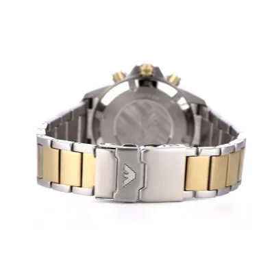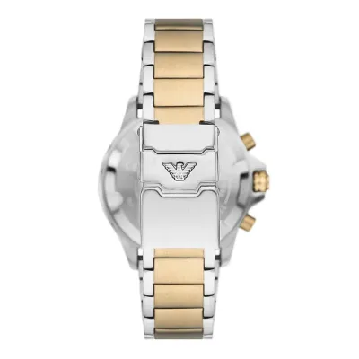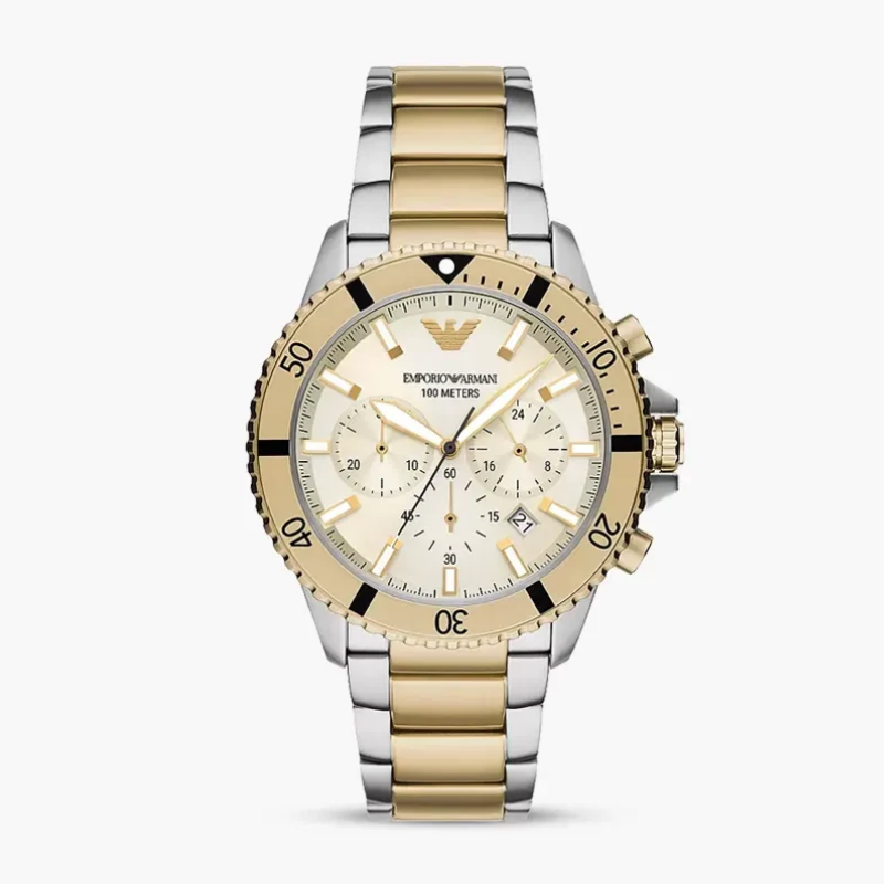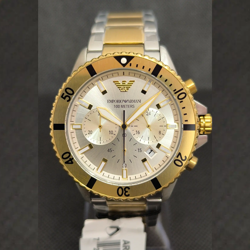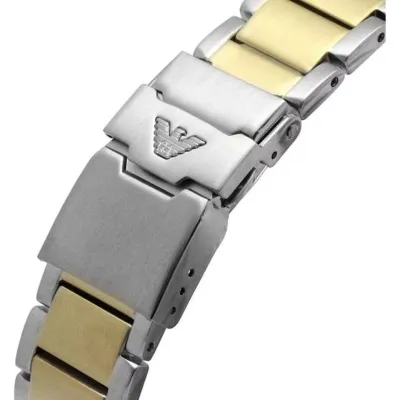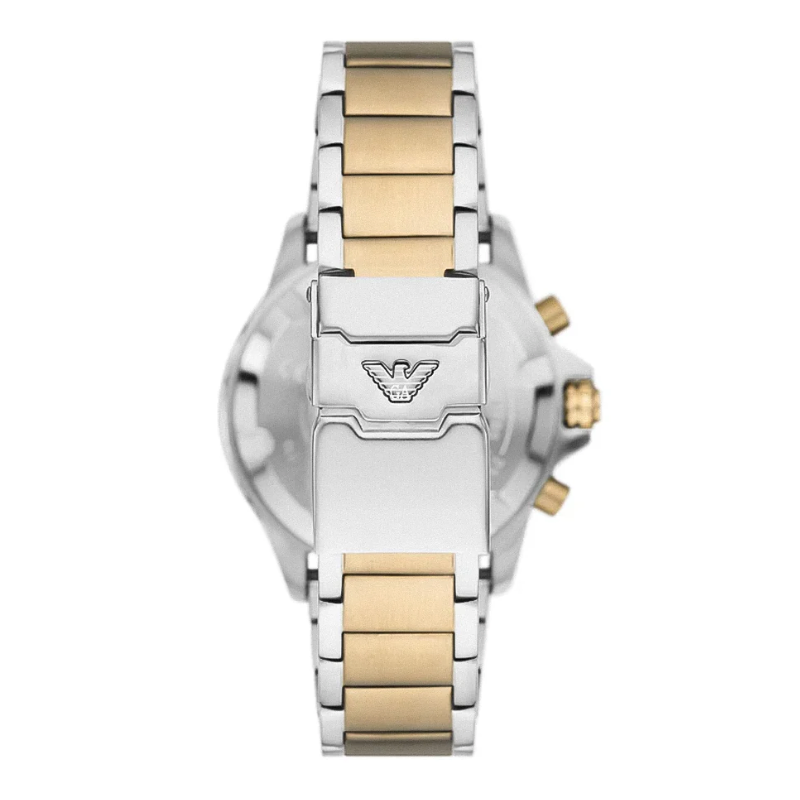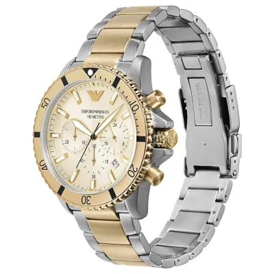 Emporio Armani Diver Chrono Silver/Pale gold AR11606 is an elegant monochrome dive watch made entirely of gold and silver-colored stainless steel. The watch has a water resistance of100 m, meaning it is suitable for swimming and snorkeling. The thickness of the case is 12 mm and the width is 43 mm making it quite proportional for a dive watch. The two-tone steel wristband is 21 mm wide, and thanks to it bi-color color scheme, the watch is easy to accessories.