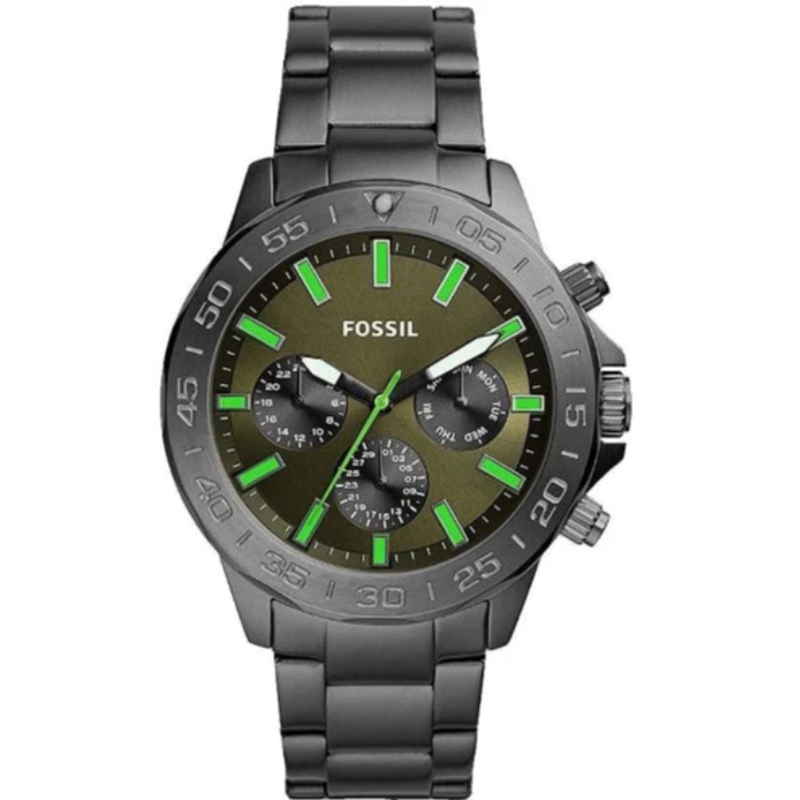 Fossil BQ2504men’s chronograph watch features a bold gunmetal stainless steel bracelet and astylish green dial with luminous markers for enhanced visibility. Designed withmultifunction sub-dials and durable quartz movement, this modern Fossil watchblends sporty performance with everyday elegance—perfect for both casual andformal wear.