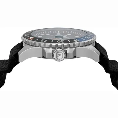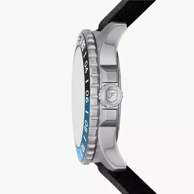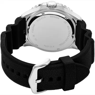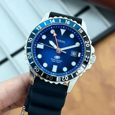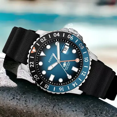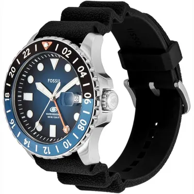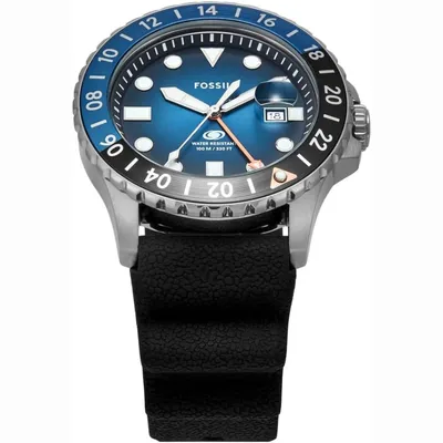 The Japanese Miyota2115 quartz movement that powers the Fossil Blue GMT FS6049 men's watch has a three-year service life. The silver stainless steel envelope has a bezel in shades of blue and black. The watch has a magnifying glass showing the date of the days of the month and a GMT pointer. A silicon strap completes the whole. The expected water resistance of the model is 10 ATM.