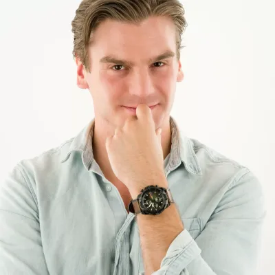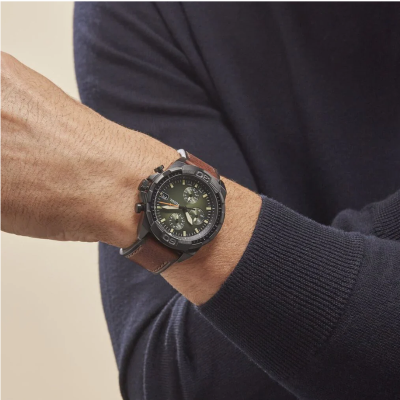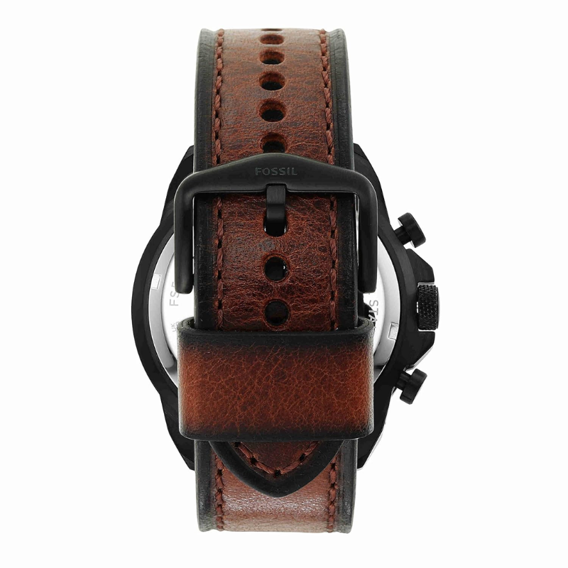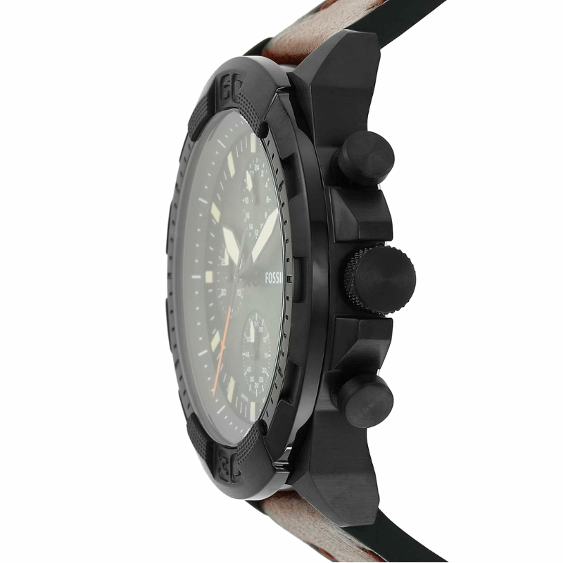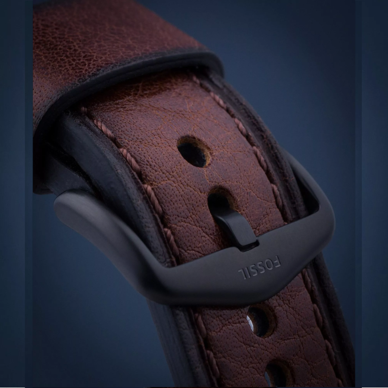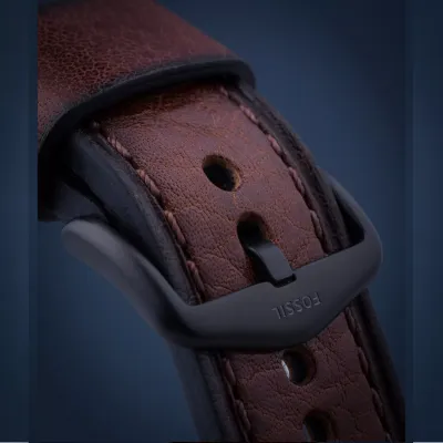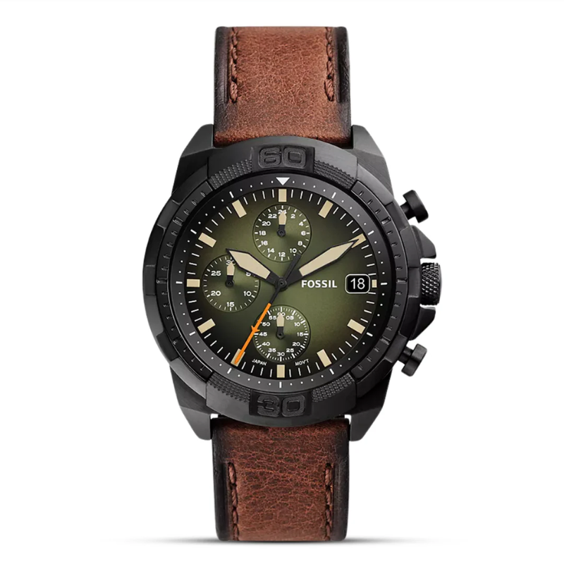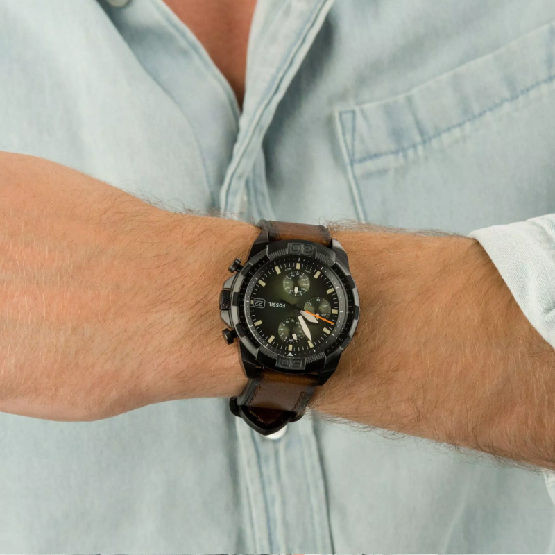 Fossil BronsonChronograph Luggage Eco FS5856 is an ecological chronograph watch made fromcompletely recycled materials. The watch has a green smokey fumè dial protectedwith mineral glass, a date display and three subdials for timekeeping. Thewristband is made of organic leather and is suitable for wrists up to 22 cm.The length of the wristband is adjustable from 160 to 215 mm. The body is 44 mmwide and 12 mm thick. The watch is waterproof up to 50 meters. Battery lifeapprox. 3 years. Fossil watches are shipped in the manufacturer's originalpackaging.