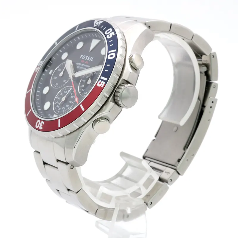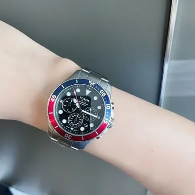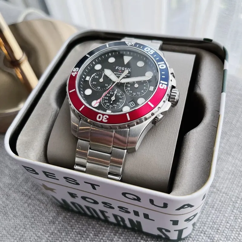 Fossil FS5767 men’s chronograph watch with a bold black dial and stylishblue-red bezel. Crafted with a durable stainless steel strap, precise quartzmovement, and 100M water resistance—perfect for sporty and every day wear witha modern premium look.