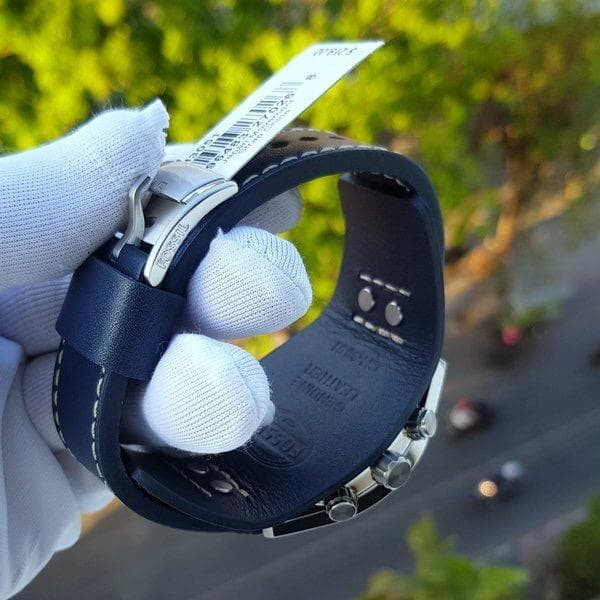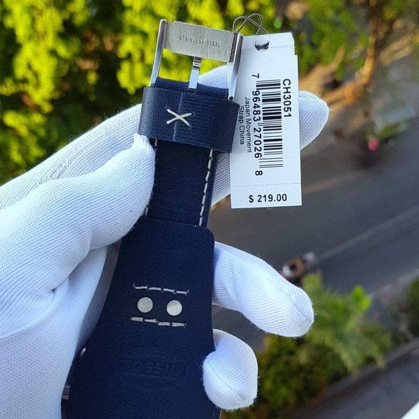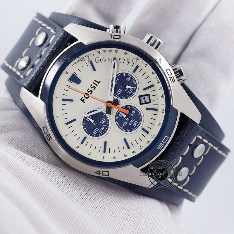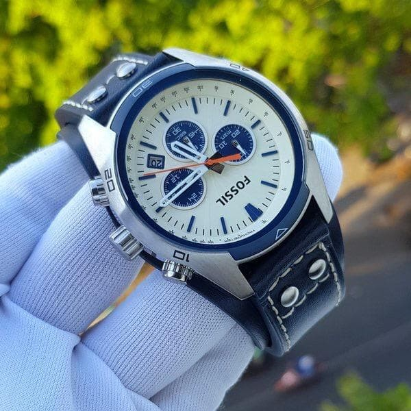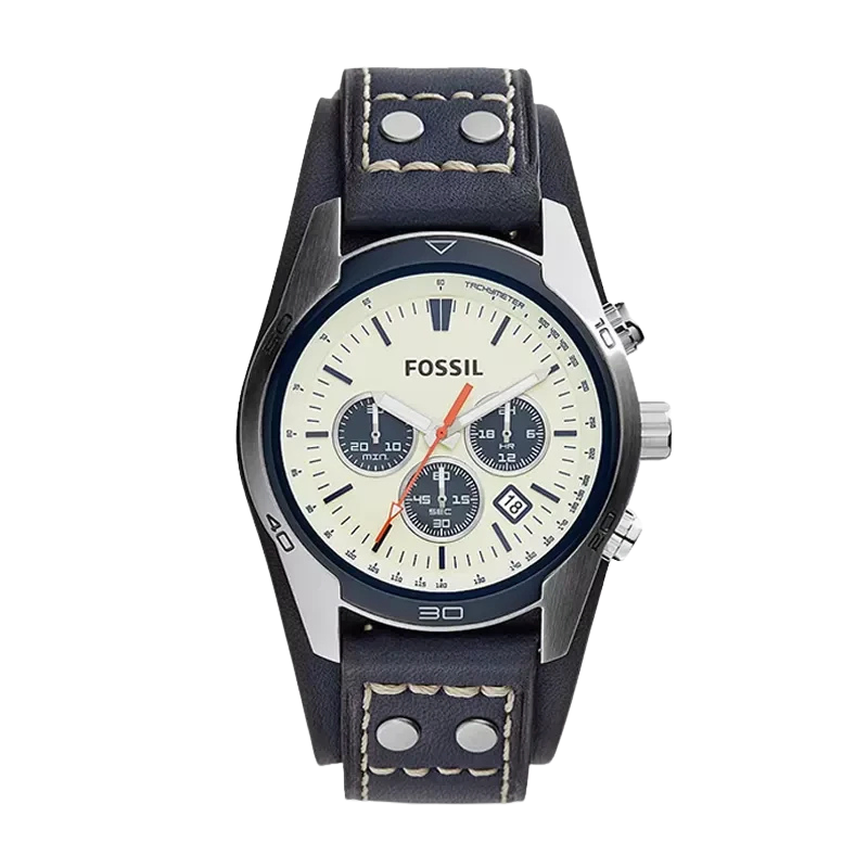 Men'sFossil Trend watch with a 44mm stainless steel case and sturdy black leathercuff strap with white stud detail. Further features include quartz chronographwith tachymeter, wood effect sub dials including 24 hour sub dial, date and 100meter water resistance.