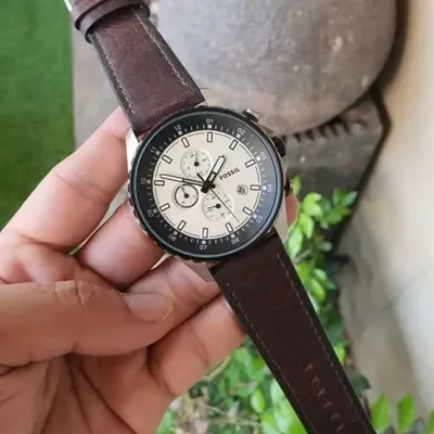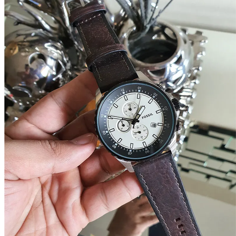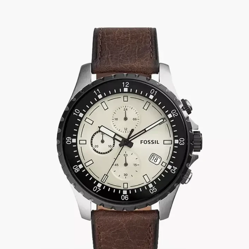 The Fossil FS5674 men’s chronograph watch features a classiccream dial with chronograph sub-dials, a bold black bezel, and a durablestainless steel case. Finished with a vintage-style brown leather strap andprecise quartz movement, it offers a perfect mix of timeless design, comfort,and reliable everyday performance.