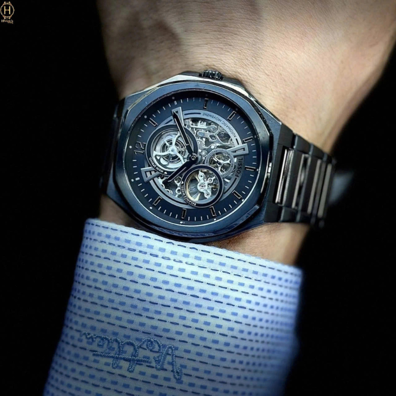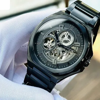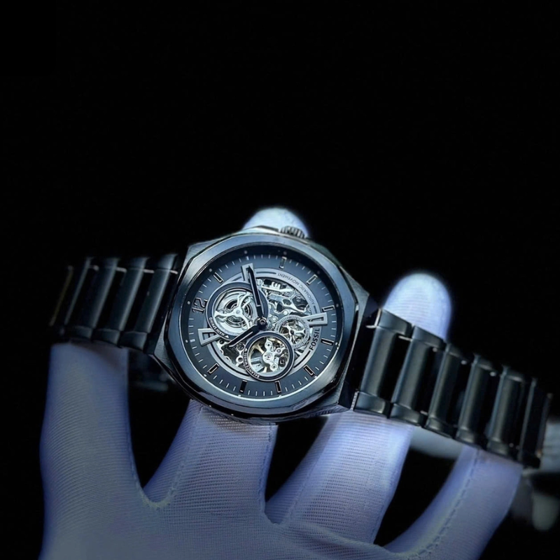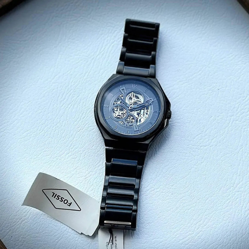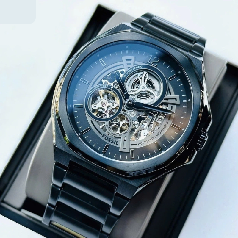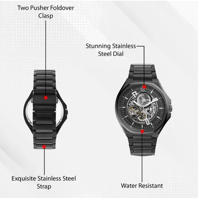 BQ2621 Skeleton Watch: This chic black luxury timepiece has a sturdy metal band, a bold skeleton dial, and an accurate automatic mechanism. Ideal for guys who value contemporary style, sophistication, and dependable functionality for both special occasions and daily wear.