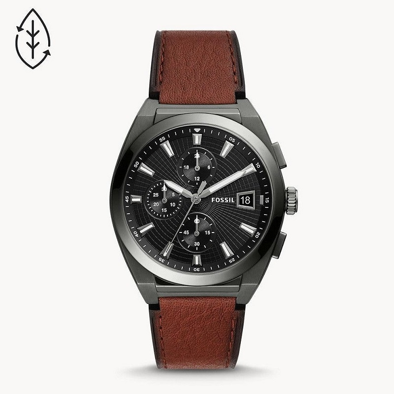 Fossil EverettChronograph FS5799 men's watch operates based on a quartz mechanism. In a grayenvelope made of stainless steel was placed a black, guilched shieldsupplemented with a date of the month of the month, sub-dairy time andchronograph. The whole is complemented by a brown, leather strap made in anenergy -saving skin tanning process. This elegant watch was developed using amore efficient processing method to reduce water consumption