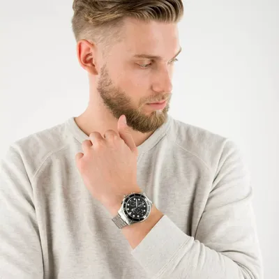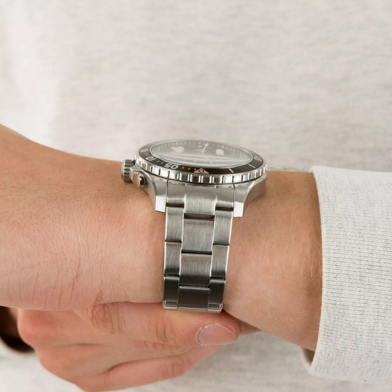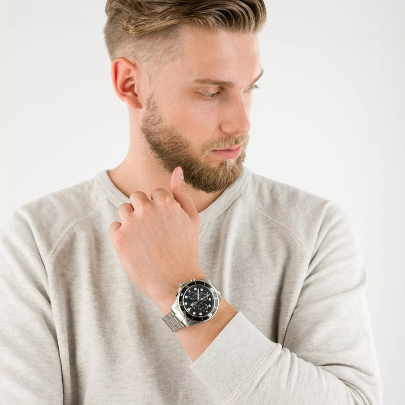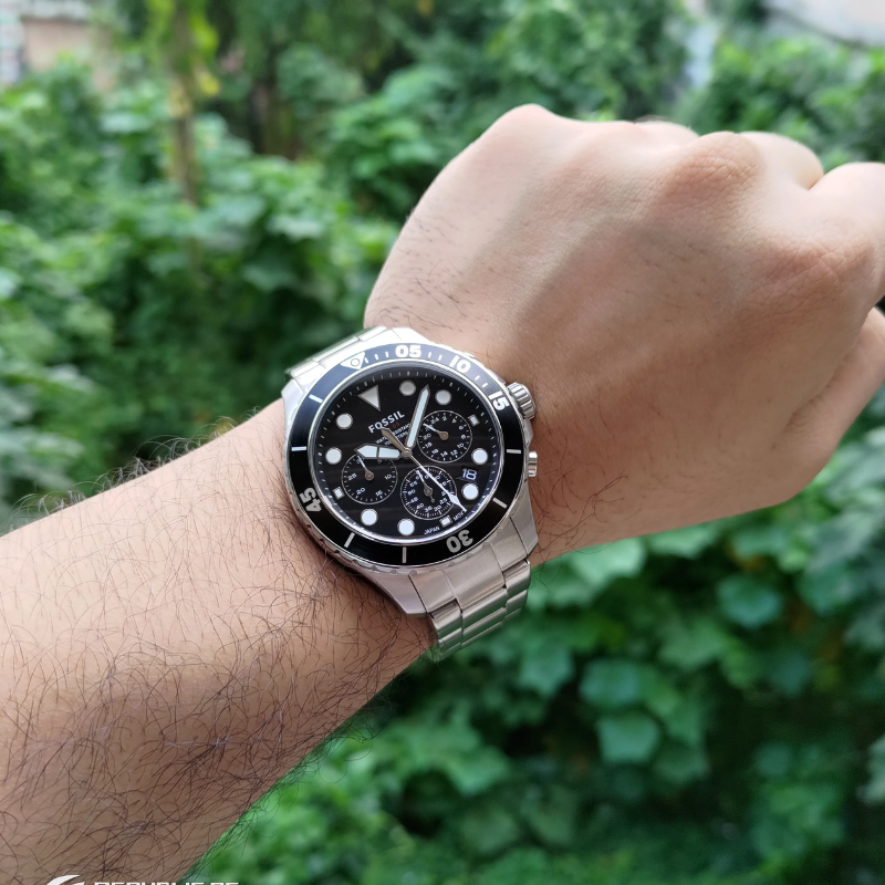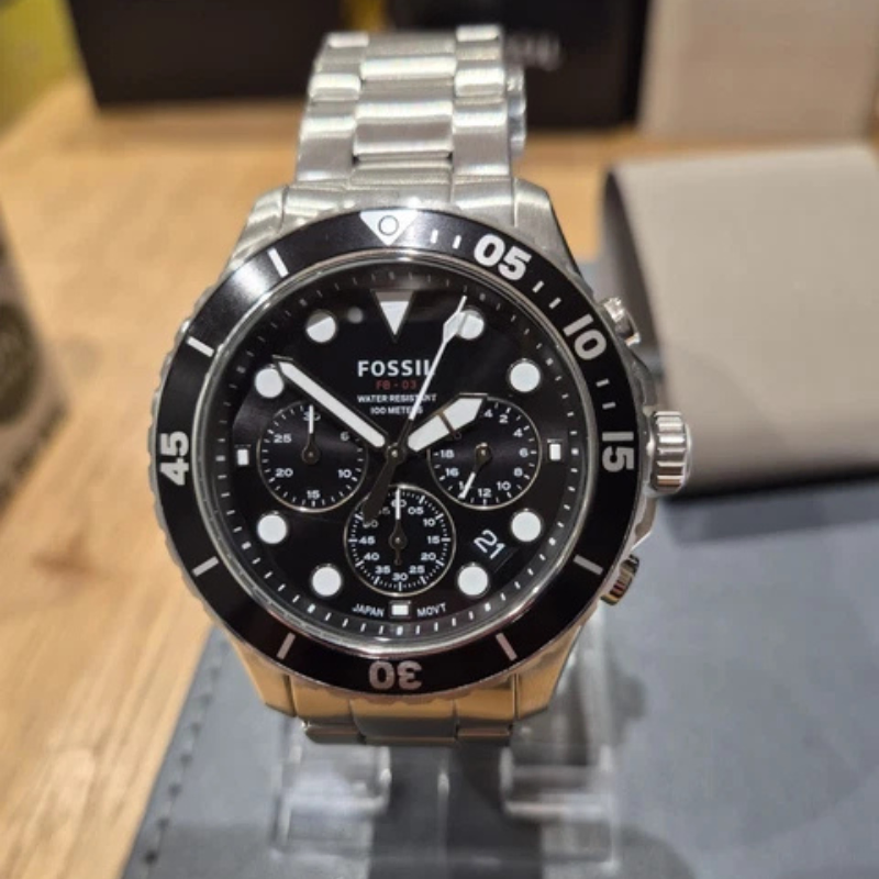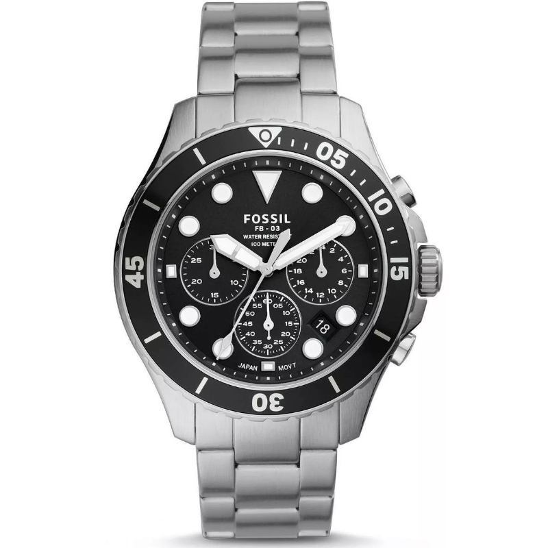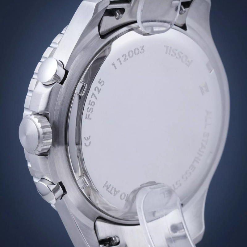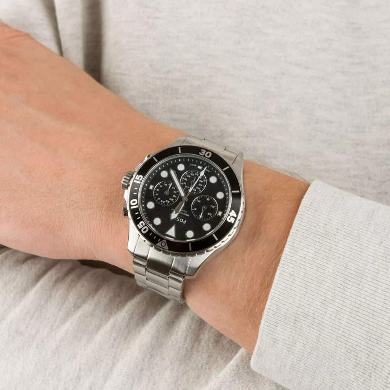 The Fossil FS5725Chronograph Watch has a rotating bezel, chronograph sub-dials, and a striking black dial with illuminated markings. This sporty watch has a rugged dive-inspired design and precise quartz movement, making it ideal for both daily use and outdoor excursions. It is made with a sturdy stainless steel case and strap.