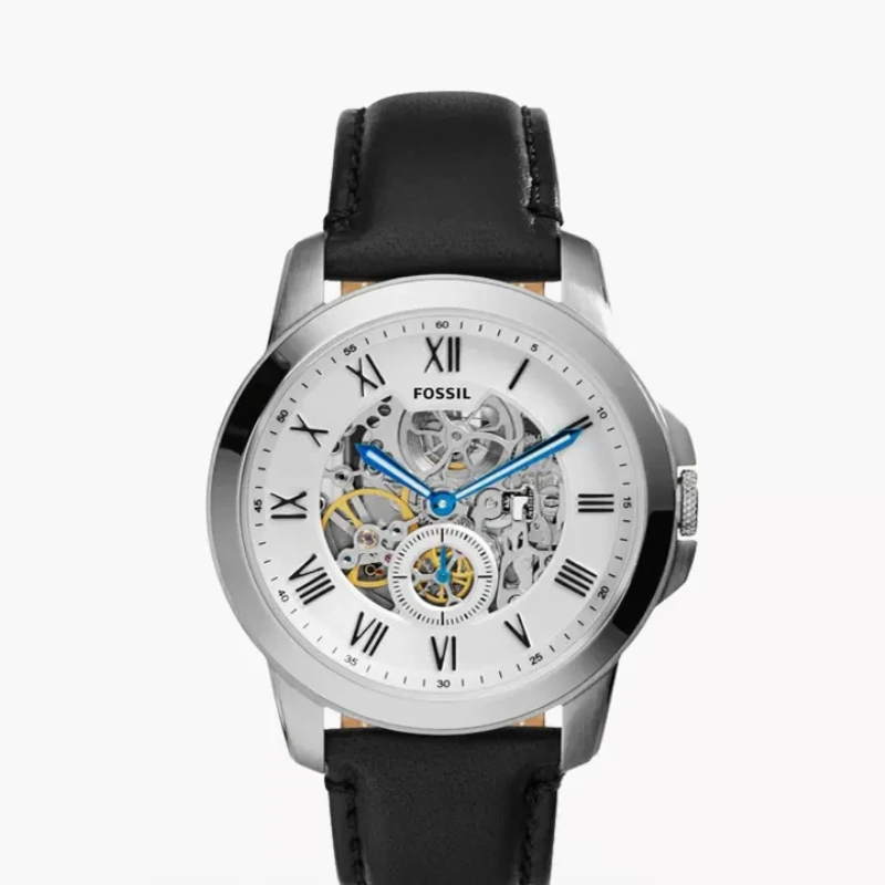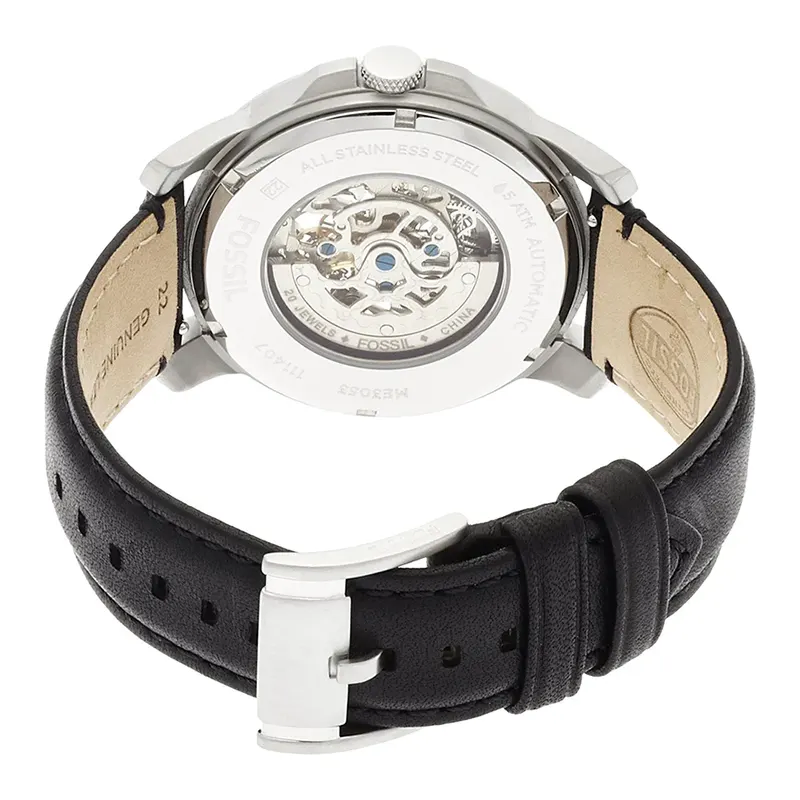 The Fossil ME3053 Grant Automatic is a stylish men’s watch featuring a skeleton dial that showcases the mechanical movement, a 44mm stainless steel case, and a classic black leather strap. With Roman numeral hour markers, mineral crystal protection, and automatic self-winding movement, this watch offers a perfect blend of vintage design and modern precision for everyday sophistication