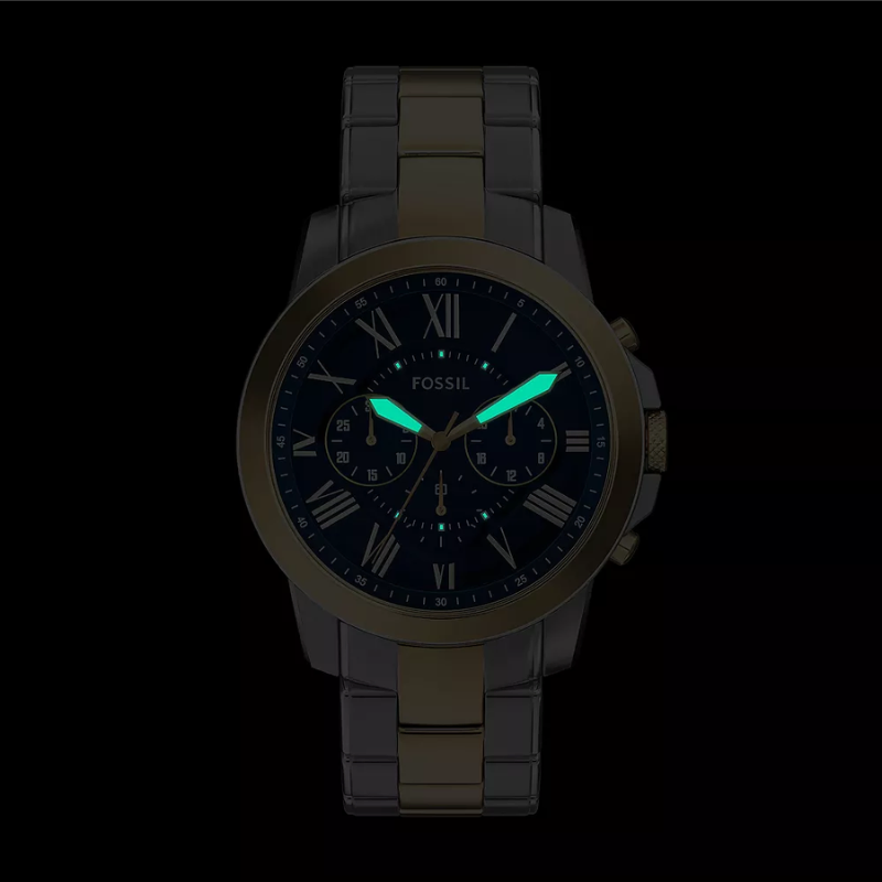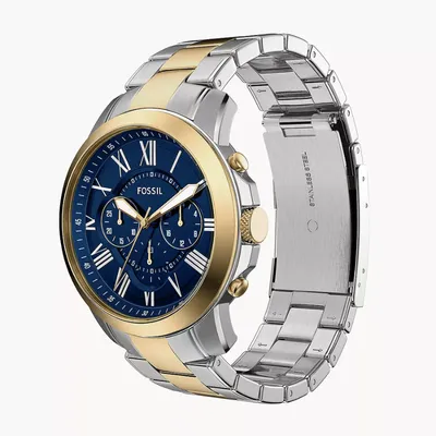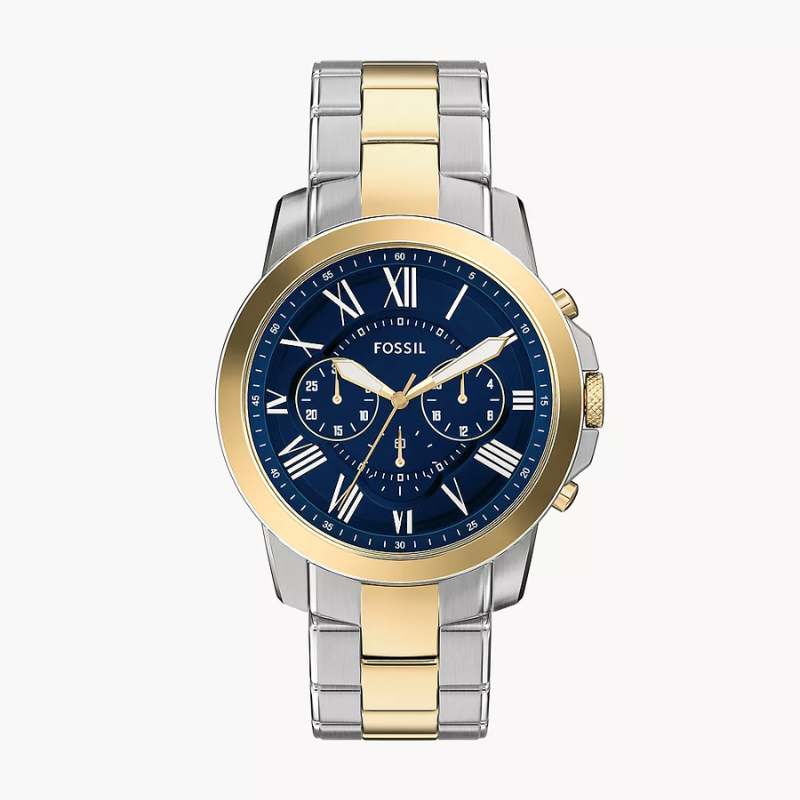 The Fossil FS6132 Grant Chronograph is a sophisticated men’stwo-tone stainless steel watch featuring a bold blue dial, Roman numeralmarkers, and a 44mm gold-tone bezel case. Equipped with quartz chronographmovement, stopwatch sub-dials, mineral crystal glass, and 50m water resistance,it delivers a perfect combination of classic style, precision, and durabilityfor everyday wear.