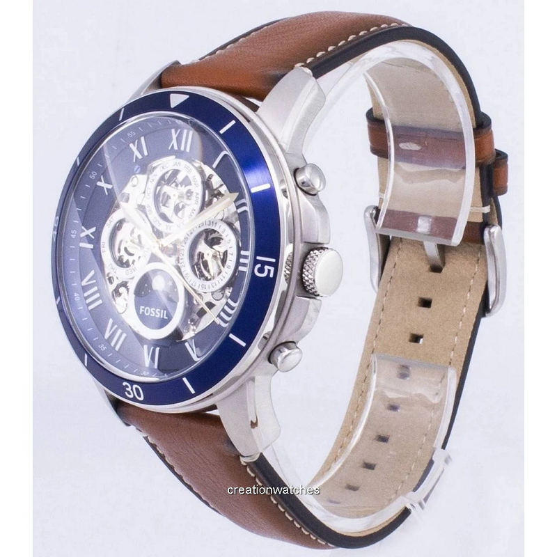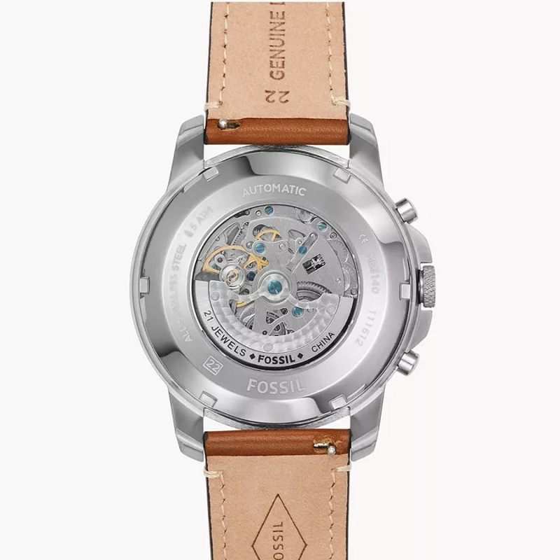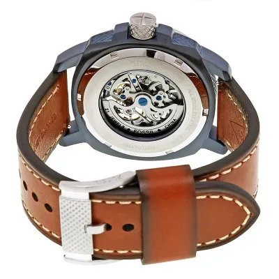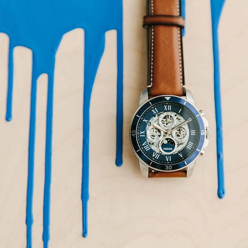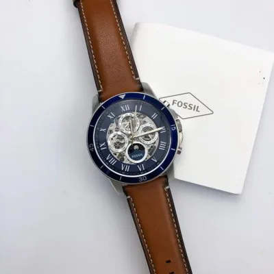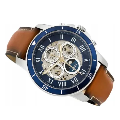 The Fossil Grant is a distinguished men's watch that exudes both elegance andfunctionality. it houses a captivating blue dial protected by ascratch-resistant mineral crystal. The transparent case back reveals theintricate automatic movement within, ensuring reliable timekeeping. Its roundcase is complemented by a stylish blue bezel and a comfortable light brownleather strap, fastened securely with a tang clasp. offering a casual yetrefined look. this watch combines timeless style with moderndurability.