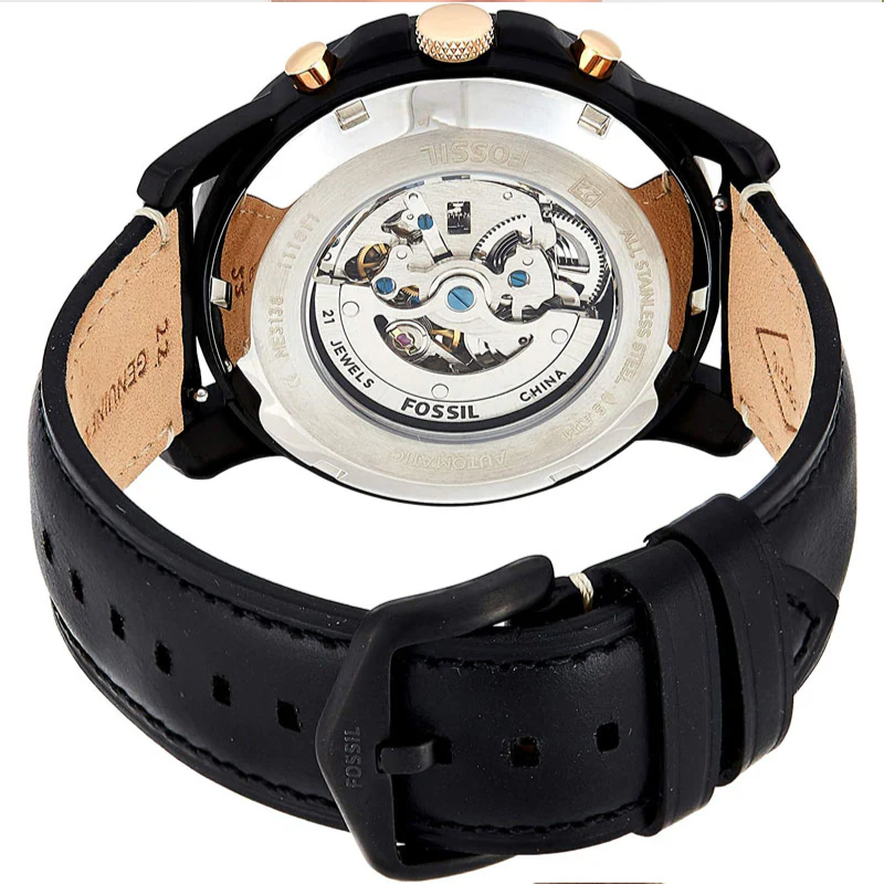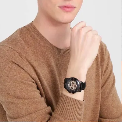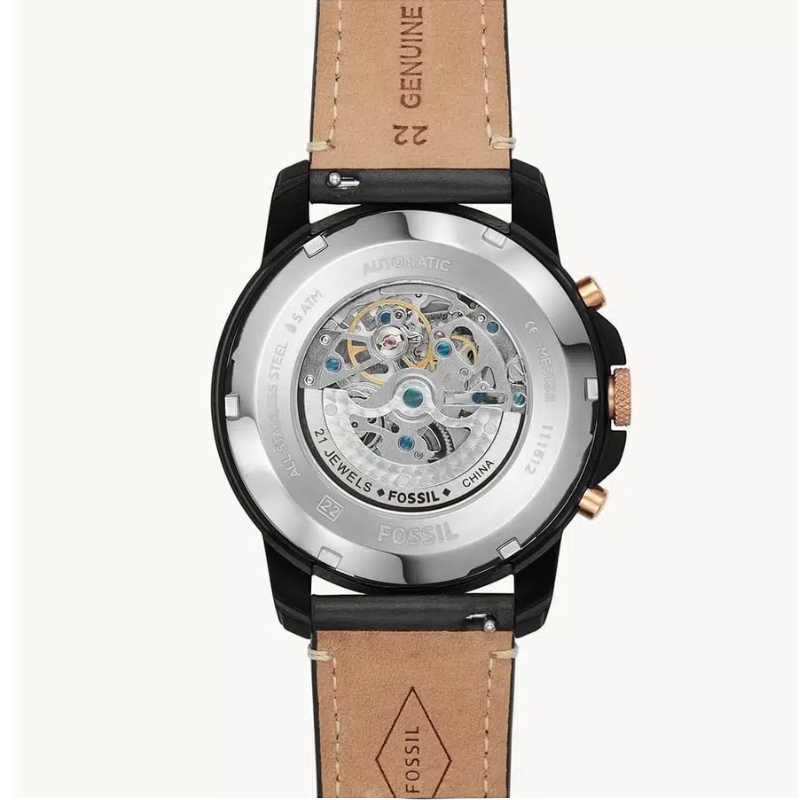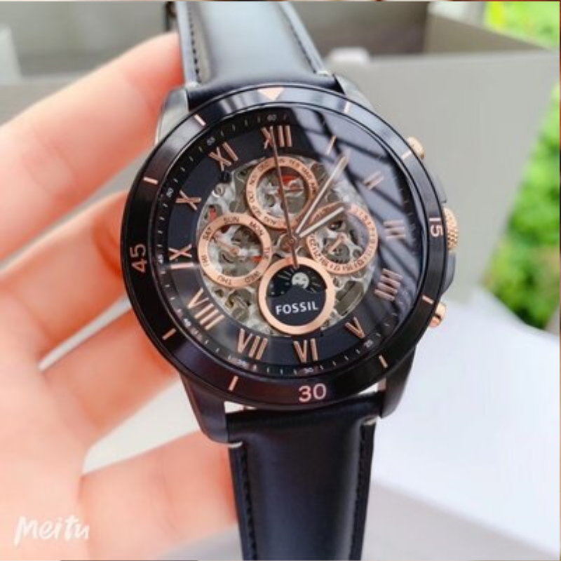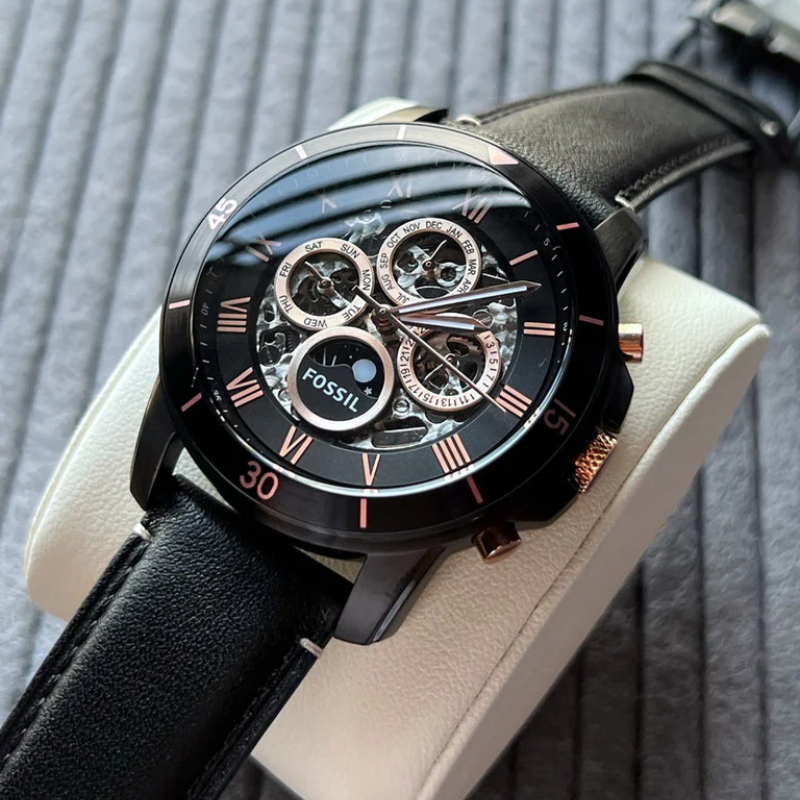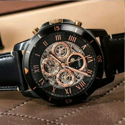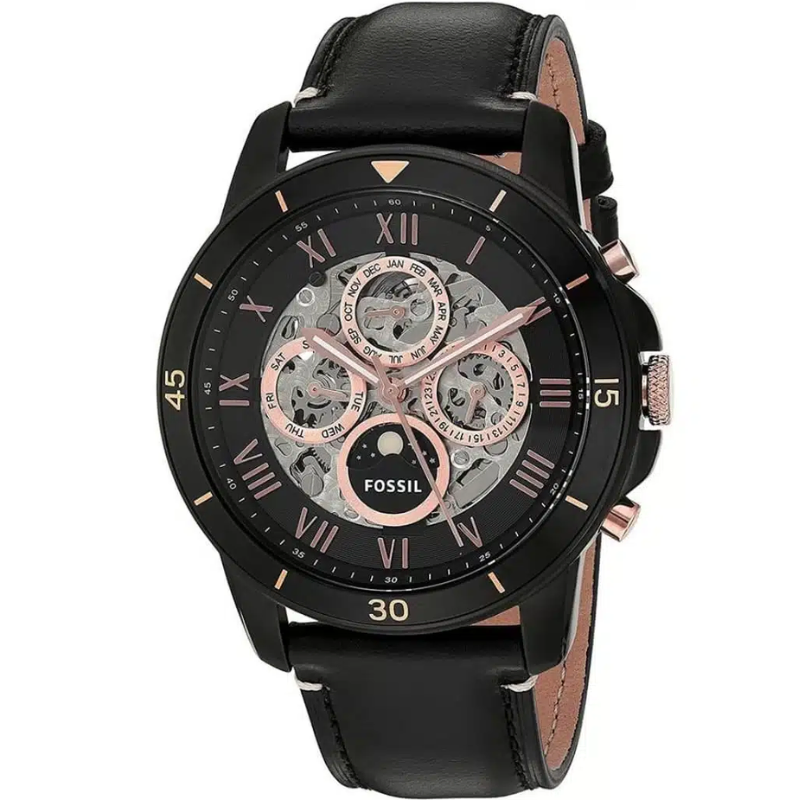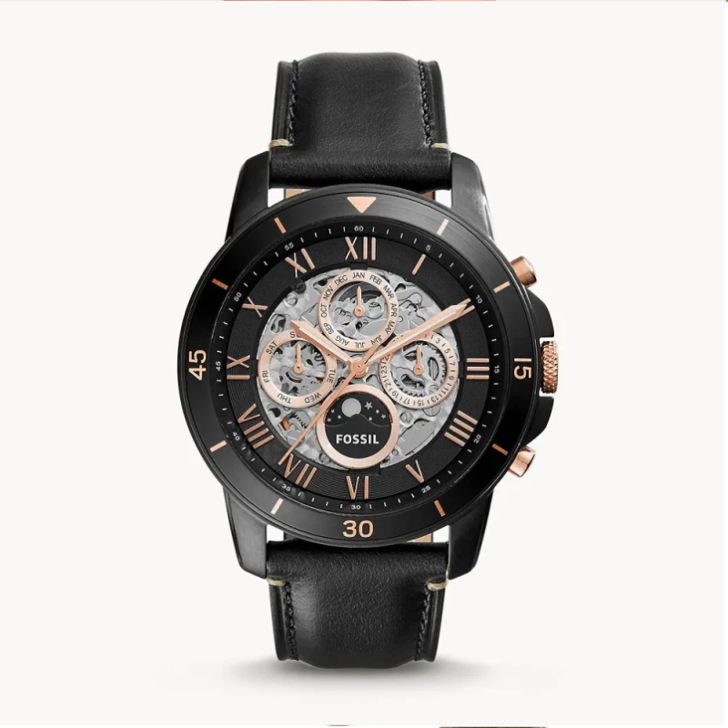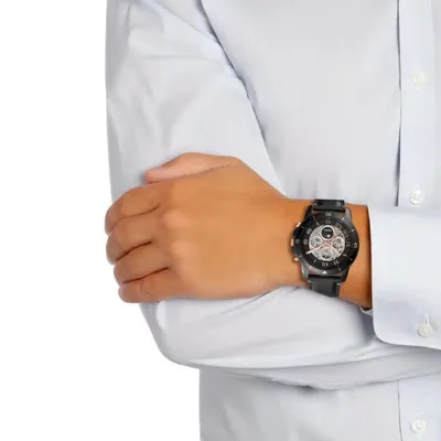 This elegant Grant isa superb investment suitable for any event and is a heavenly piece to own. This classic chronograph watch is updated for the current season. This men's Grant watch made of stainless steel has a clear skeleton face with a black dial plate and rose-gold-tone indices that highlight the mechanical watch's gears. The ensemble is finished with a polished black leather strap. For any formal occasion, this watch is ideal.