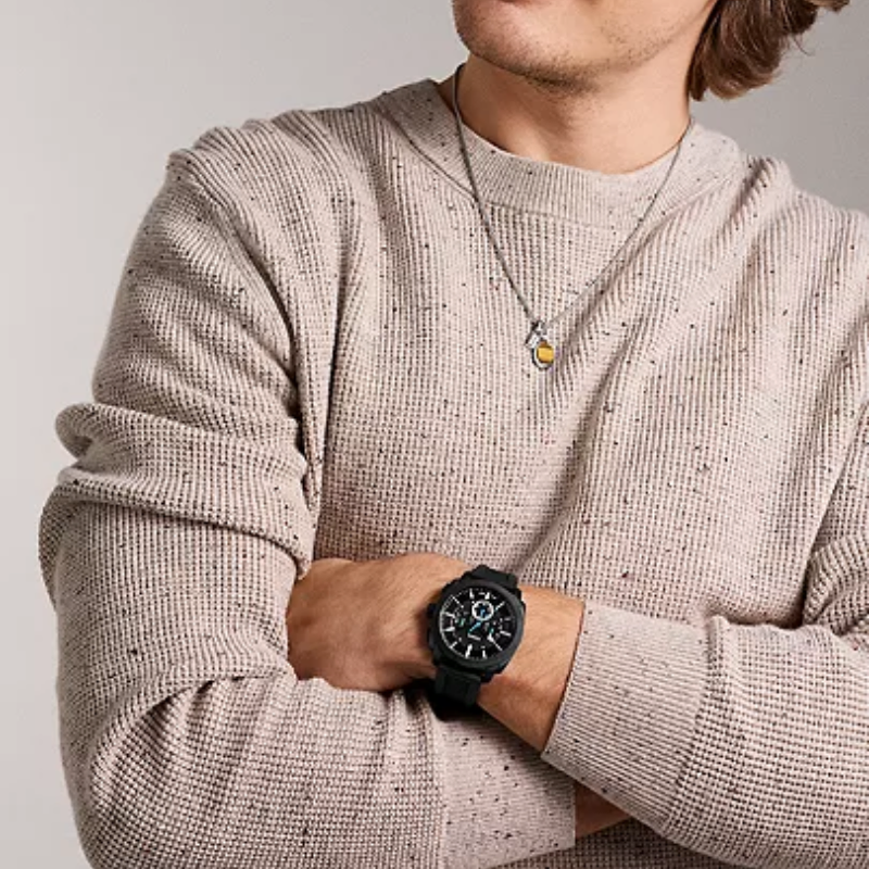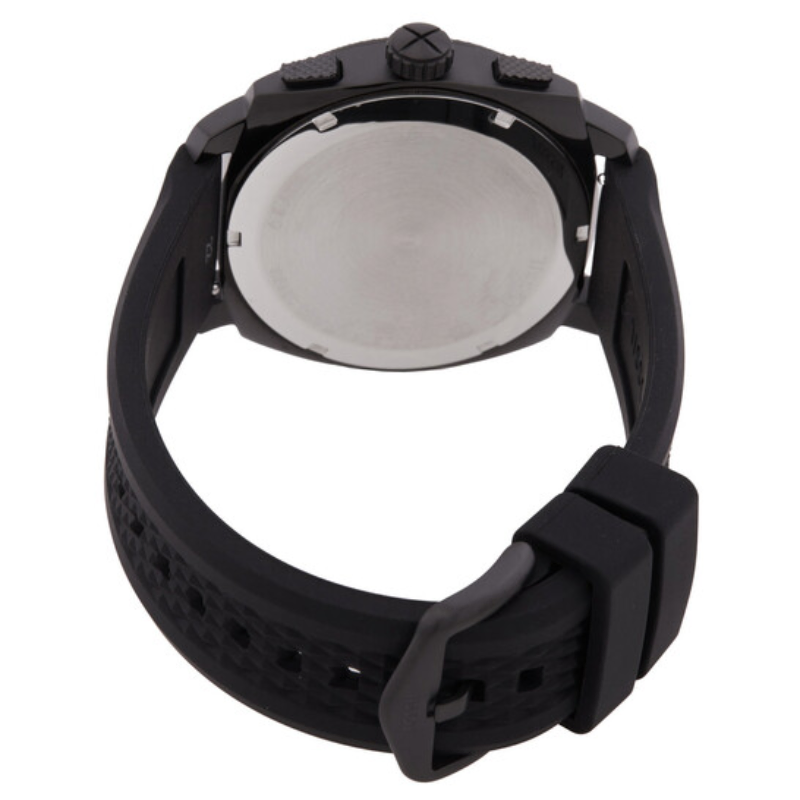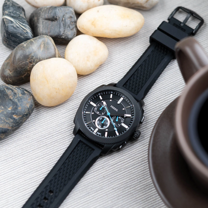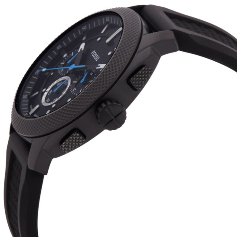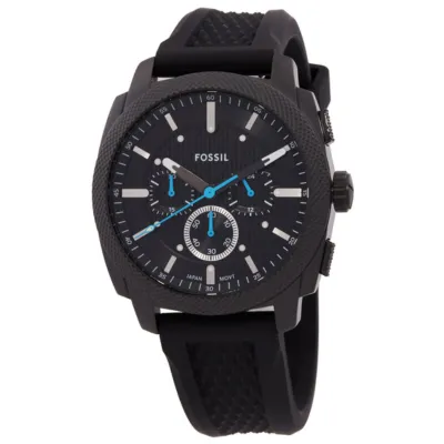 Inspired by classicAmerican machinery, the Machine Chronograph commands attention with its boldknurled topring. Unmistakably masculine with a bold 44mm case housing a brushedblack dial with textured details, all protected by a mineral crystal face. Poweredby a precision quartz chronograph movement, this rugged timepiece is built tolast with a durable black silicone strap. A true statement inindustrial-inspired design.