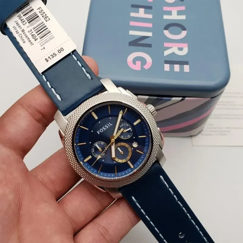 The Men's Fossil Machine Quartz Chronograph Blue Dial Watch (FS5262) has a date display and a bold chronograph sub dials on a beautiful blue dial. It is made of sturdy stainless steel and comes with a sturdy bracelet. Perfect for both formal occasions and daily wear, this piece combines modern practicality with industrial style. Men's timepieces from Fossil come in a variety of styles, from traditional to modern.