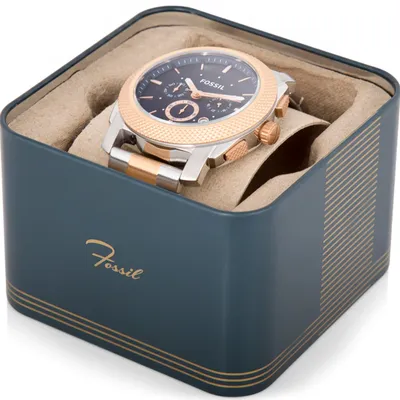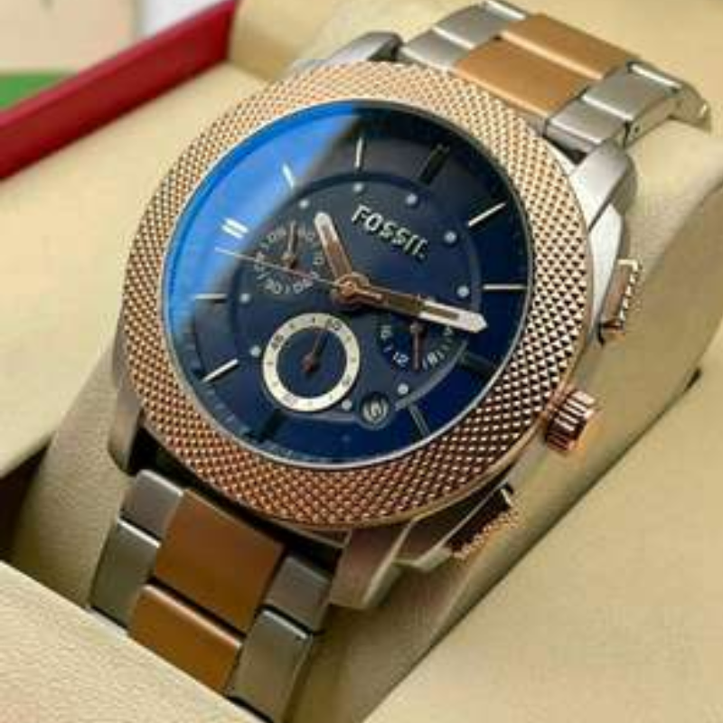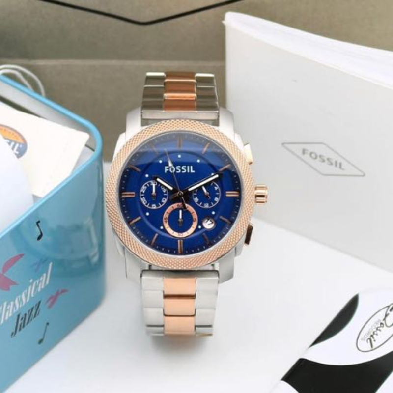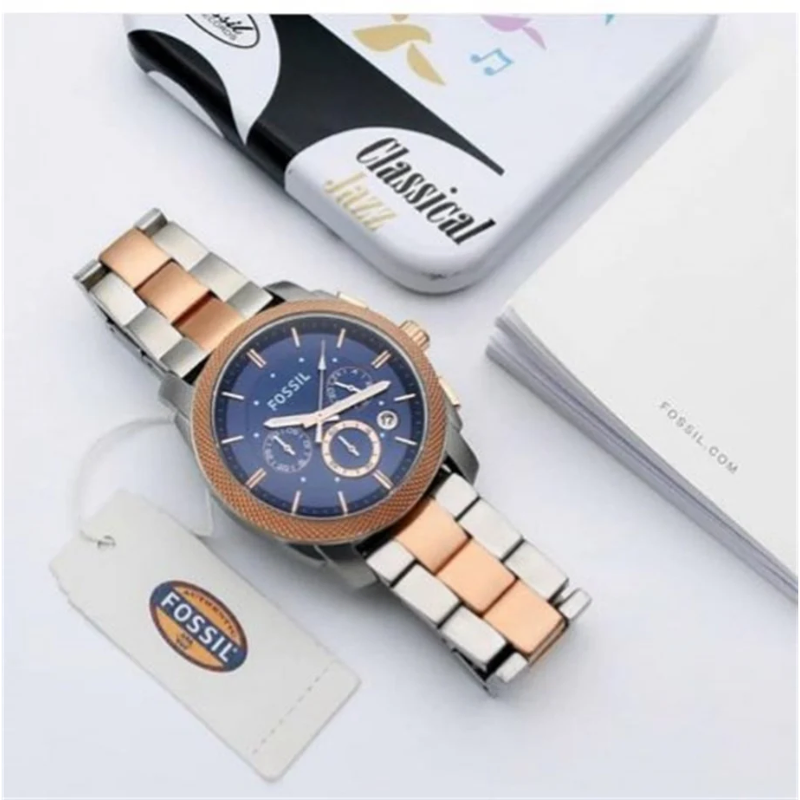 Fossil FS5037 is a stylish men’s chronograph watch featuringa deep blue dial, rose-gold tone bezel, and two-tone stainless steel bracelet.Designed with multifunction sub-dials and durable quartz movement, it combinesmodern elegance with everyday reliability—perfect for both casual and formalwear.