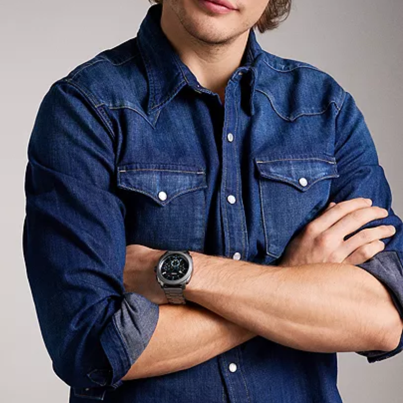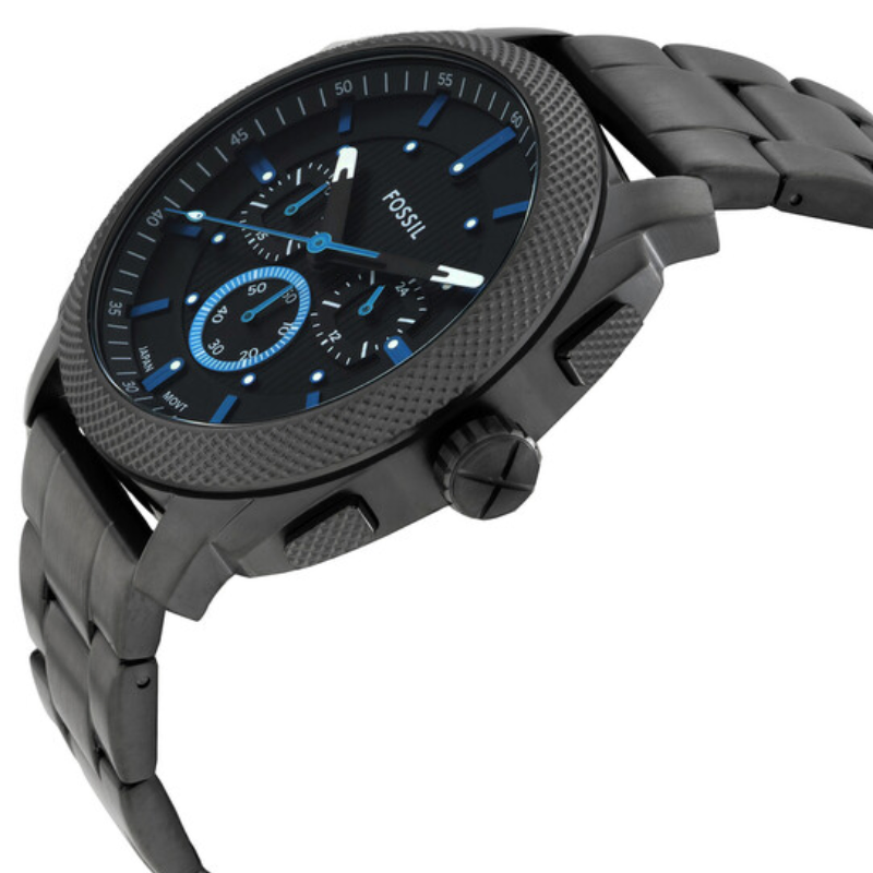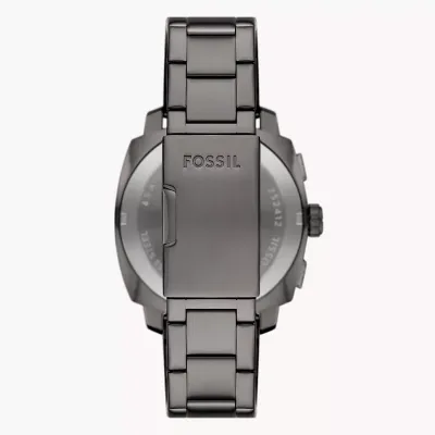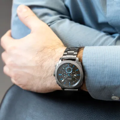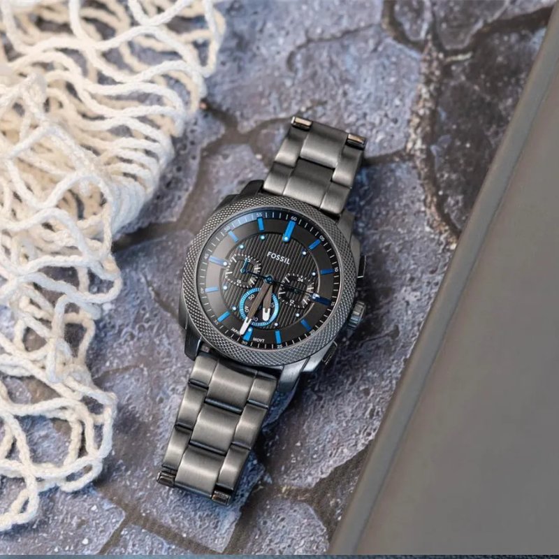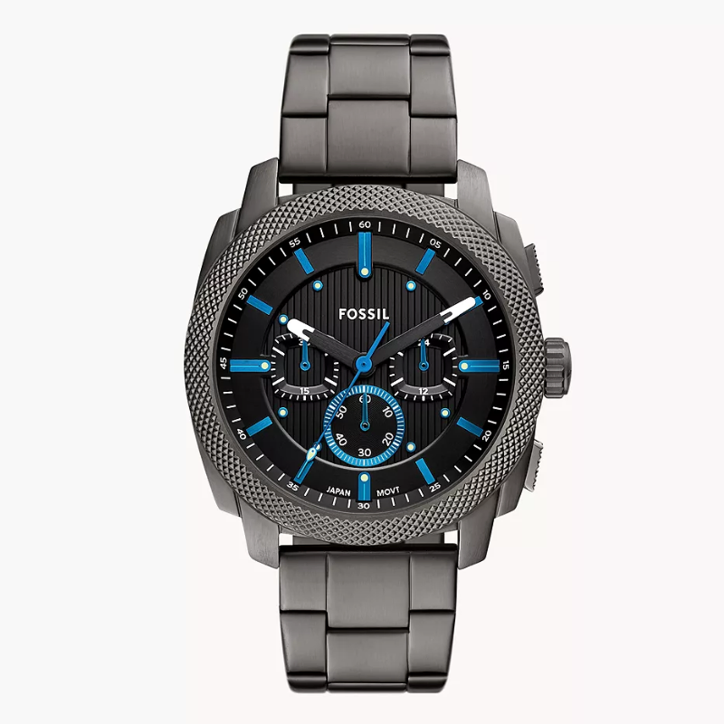 Inspired by classic American machinery, the Machine Chronograph commands attention with its bold knurled top ring. Unmistakably masculine with a bold 44 mm case housing a brushed black dial with textured details, all protected by a mineral crystal face. Powered by a precision quartz chronograph movement, this rugged timepieces built to last with a durable gunmetal stainless steel bracelet. A true statement in industrial-inspired design.
