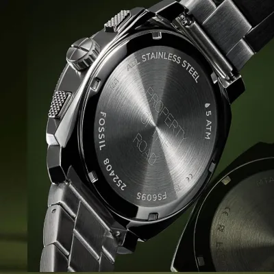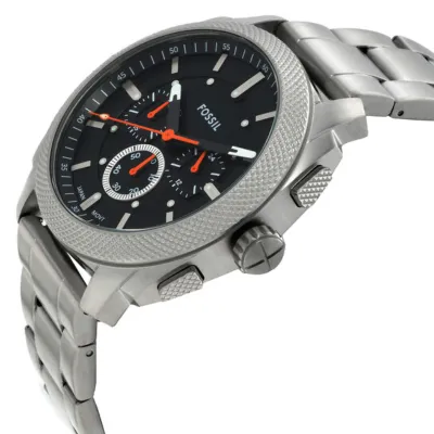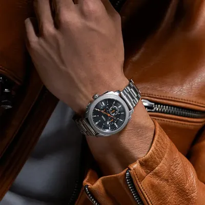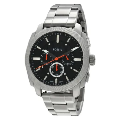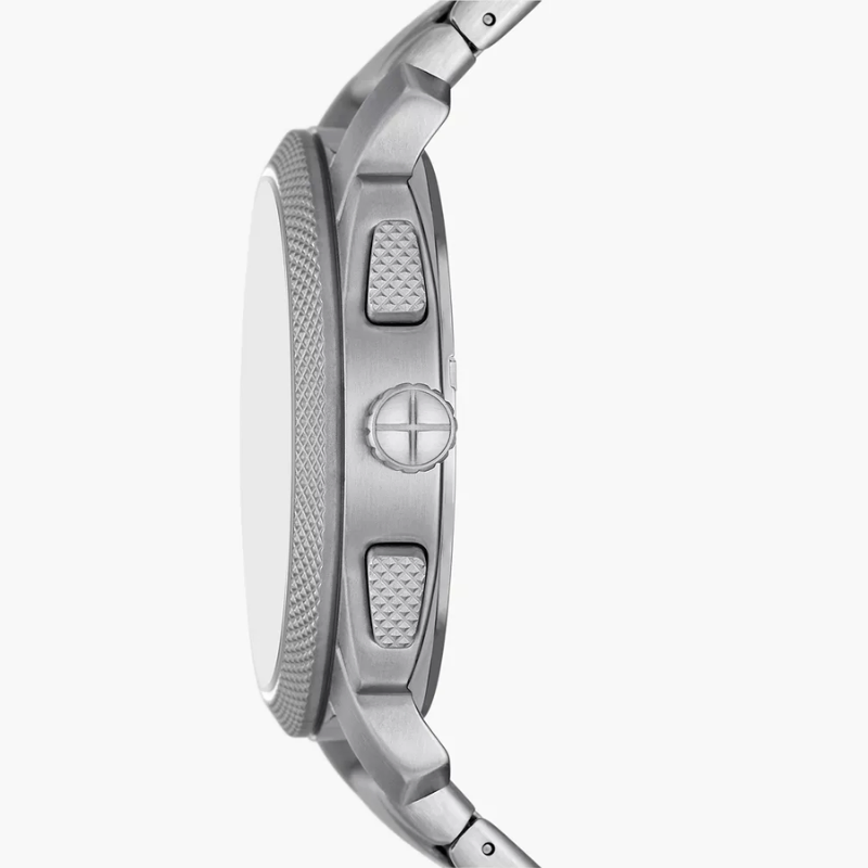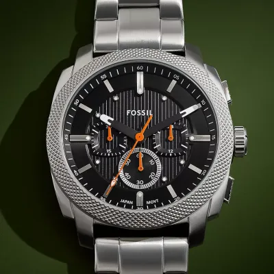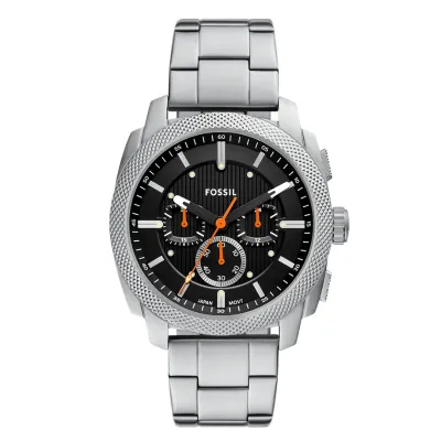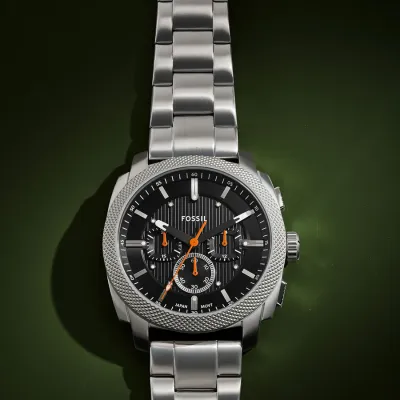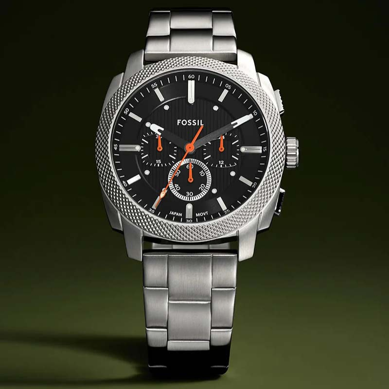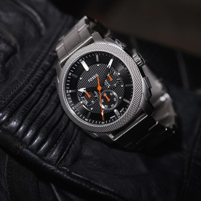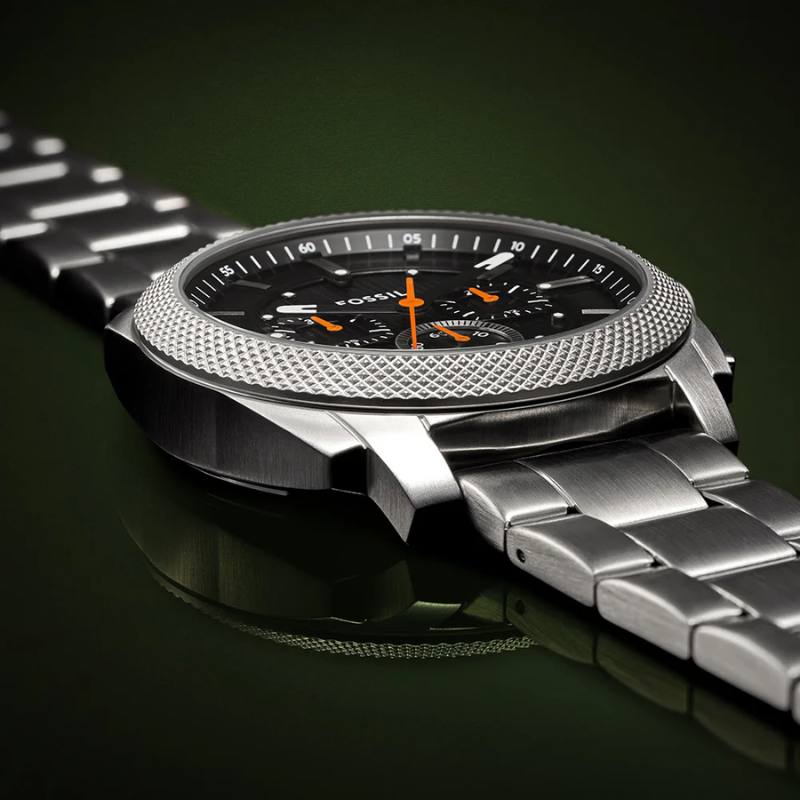 Inspired by classic American machinery, the Machine Chronograph commands attention with its bold knurled top ring. Unmistakably masculine with a bold 44 mm case housing a brushed black dial with textured details, all protected by a mineral crystal face. Powered by a precision quartz chronograph movement, this rugged timepieces built to last with a durable stainless steel bracelet. A true statement IN industrial-inspired design.