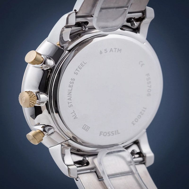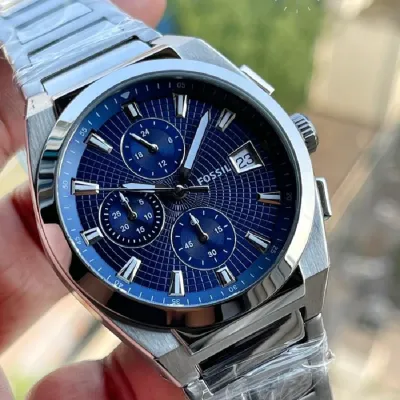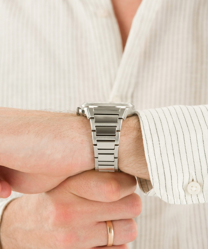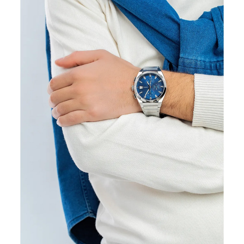 Stainlesssteel case with a stainless steel bracelet. Fixed stainless steel bezel. Bluedial with luminous silver-tone hands and index hour markers. Arabic numeralminute markers (at 5-minute intervals). Minute markers around the outer rim.Dial Type: Analog. Luminescent hands and markers.