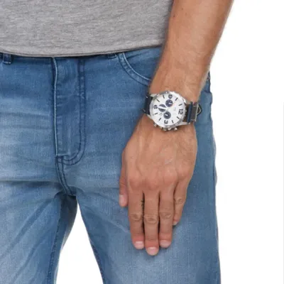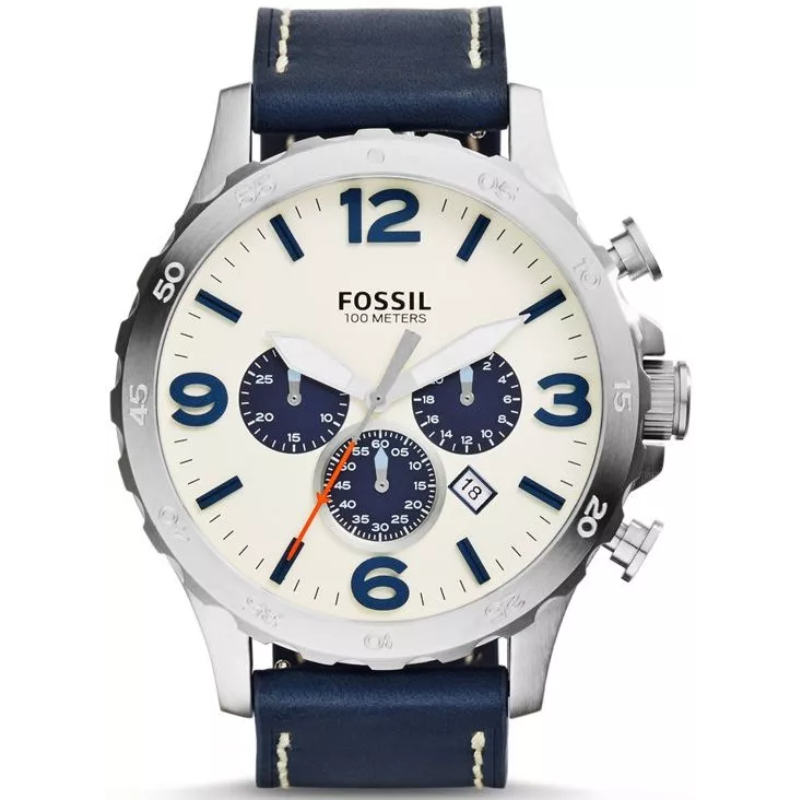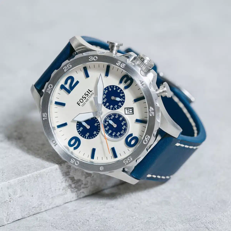 Stainless steel case with a fixed bezel and a navy blue leather strap. Arabic numerals at 3, 6, 9,and 12 on a beige analog clock with illuminated hands and index markers. Includes quartz movement, date display, scratch-resistant mineral crystal, water resistance up to 30 meters, and chronograph sub-dials. 50mm in size, with tight tang clasp.