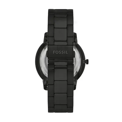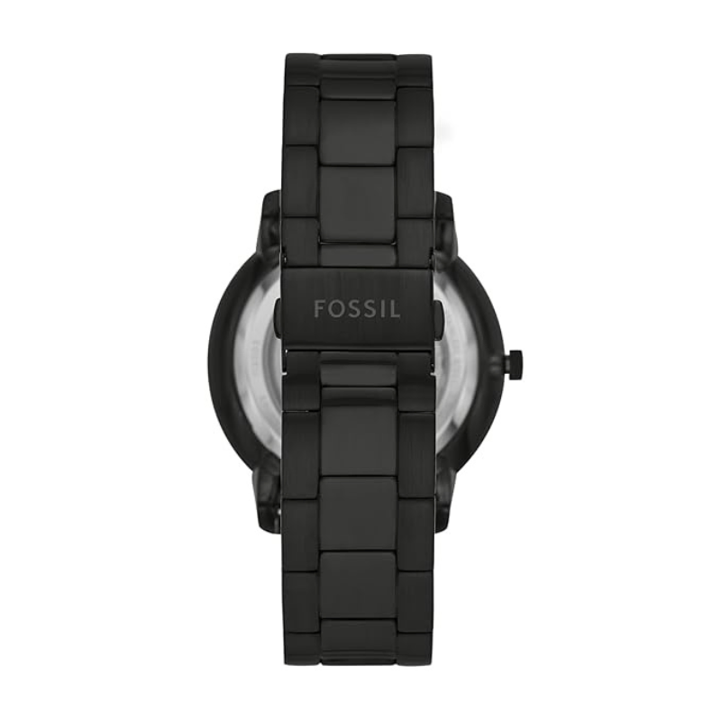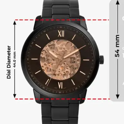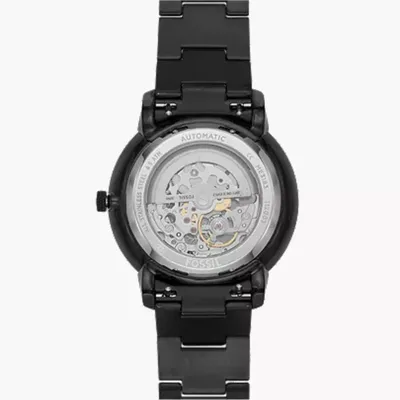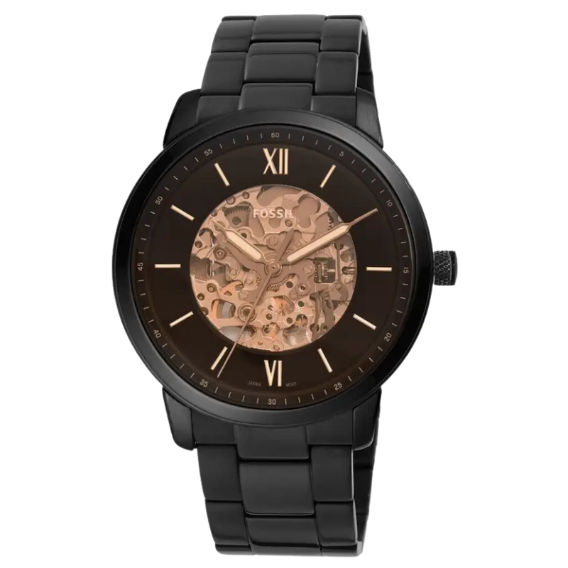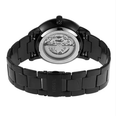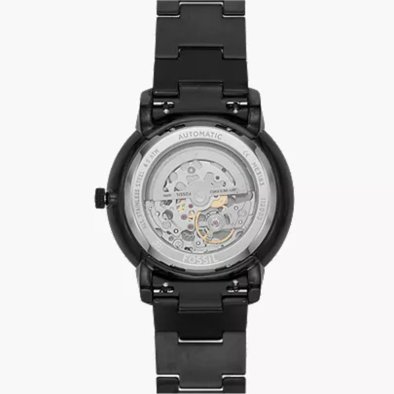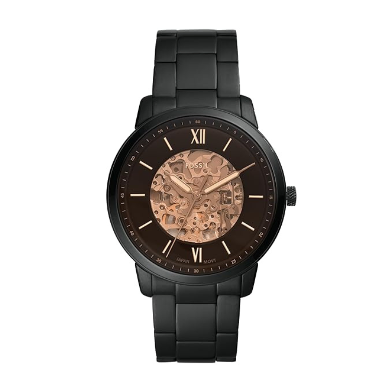This new Neutra Automatic series watch from Fossil is stunning on the inside and out. When worn on the wrist, it displays its inner working mechanism. This Fossil automatic watch has a "Art Deco" feel to it thanks to a transparent view into the mechanical gears. With its sophisticated black casing, see-through matching skeleton dial, three-hand movement, roman numeral-stick indexes, and a black stainless steel bracelet that keeps everything together, this stylish watch gives you up-to-date innovation.