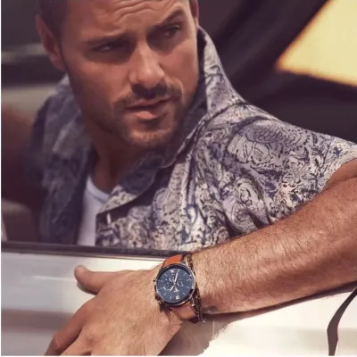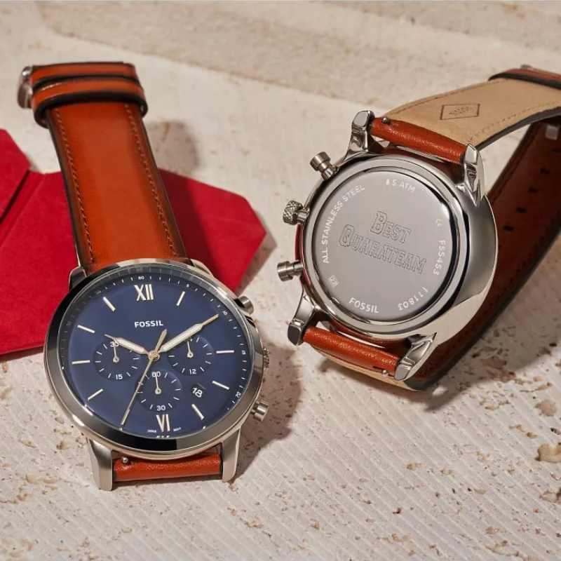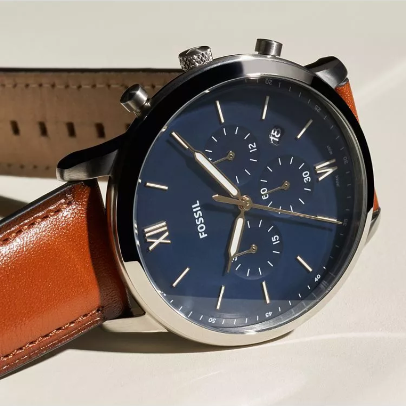The Fossil FS5453watch, which is part of the Nutra Chrono series, has a traditional, muted color palette. Its design consists of a spherical steel envelope with a blue dial inside, and a brown strap made of natural leather. A flexible mineral glass covers the dial to prevent breaking. Luminescent hands function effectively at night and in dimly lit areas. The watch has a chronograph for easy timekeeping and a date pad that shows the days of the month. The quartz mechanism makes it all work, and the watch's 50-meter water resistance ensures that it will withstand even larger splashes.