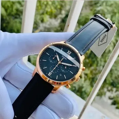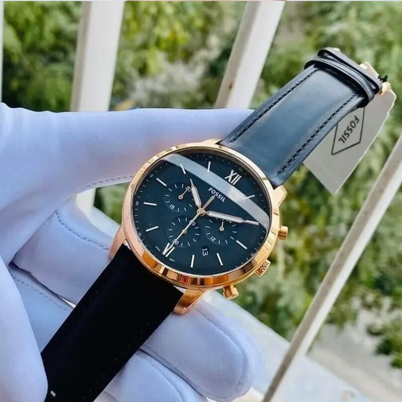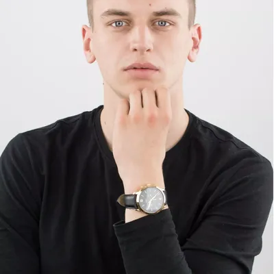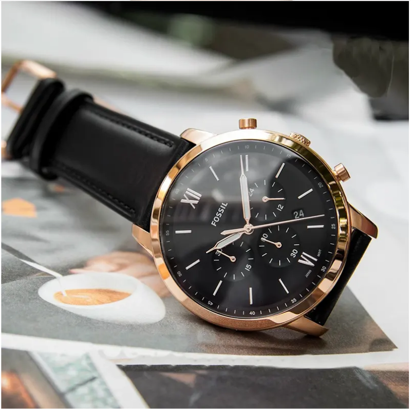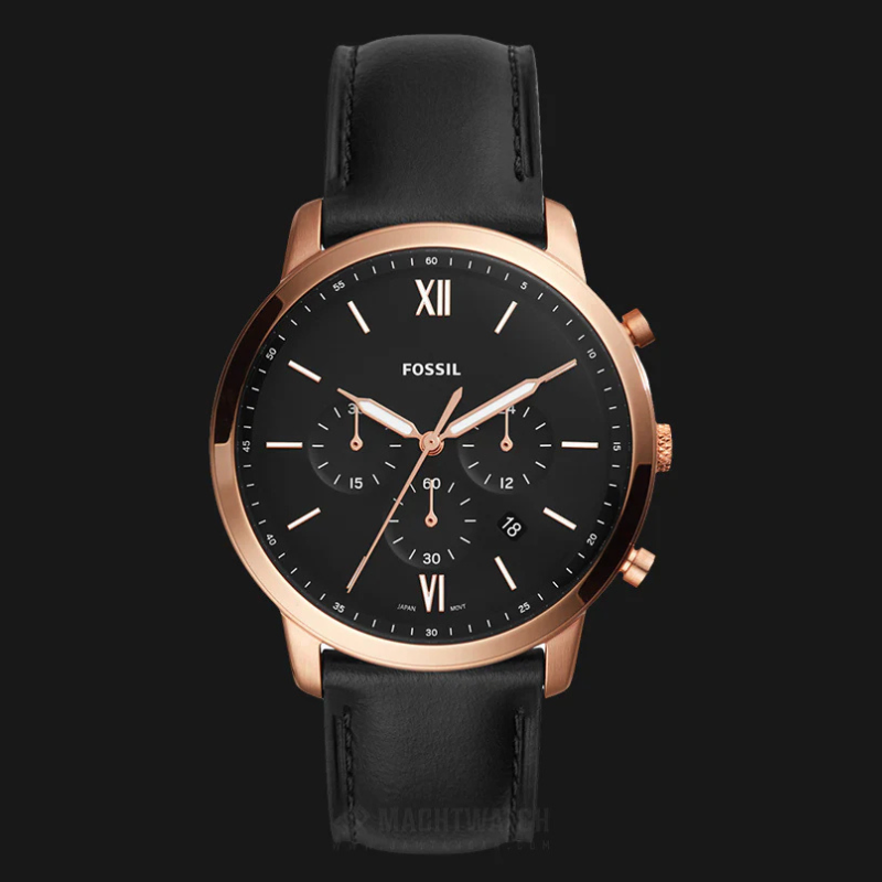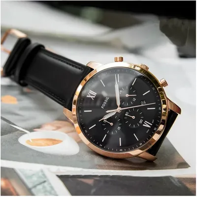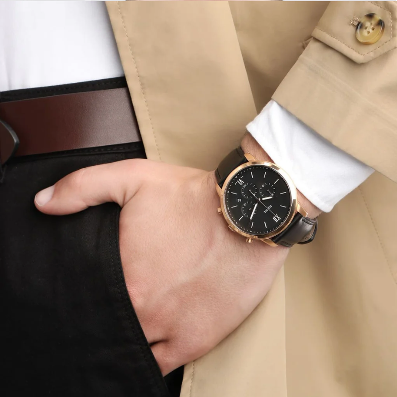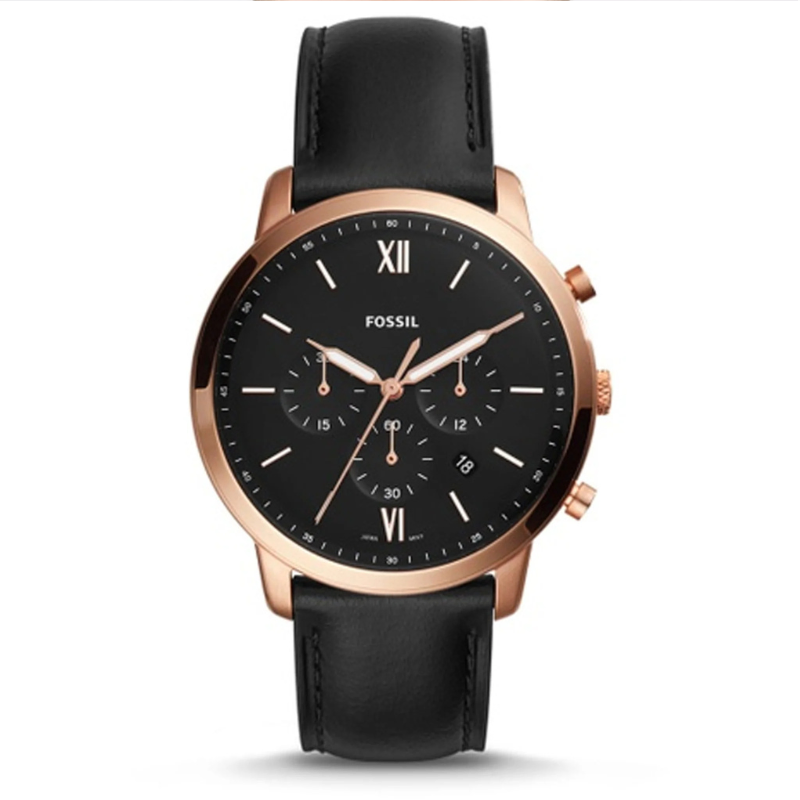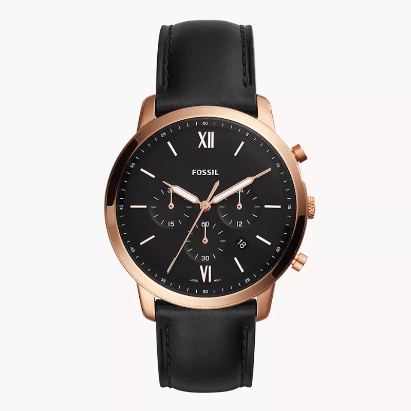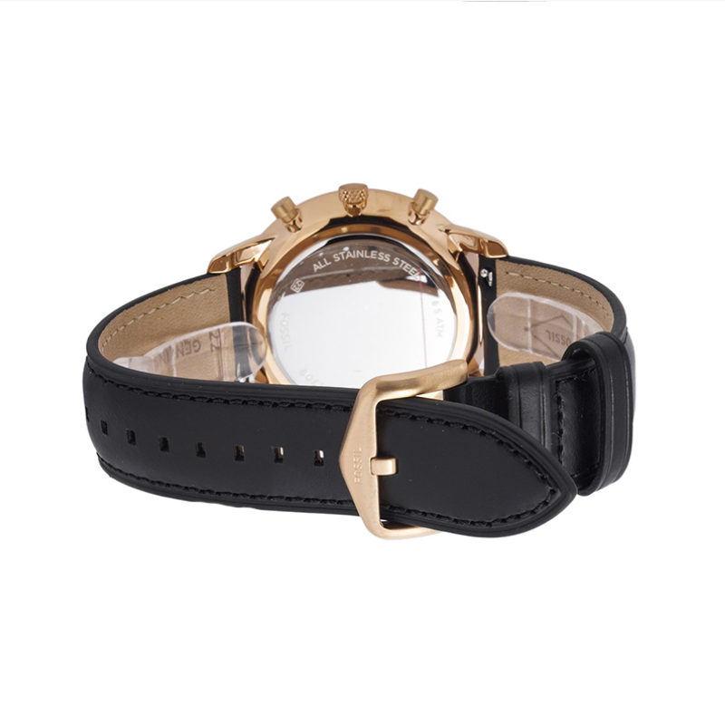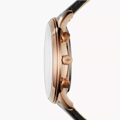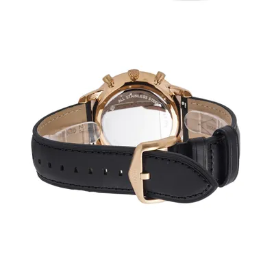Stainless steel casein rose gold with a black leather band. fixed bezel with a rose gold tone. Index hour markers and glowing rose gold-tone hands adorn the black dial. The six and twelve o'clock positions are indicated with Roman numerals. Around the outer rim are minute marks.