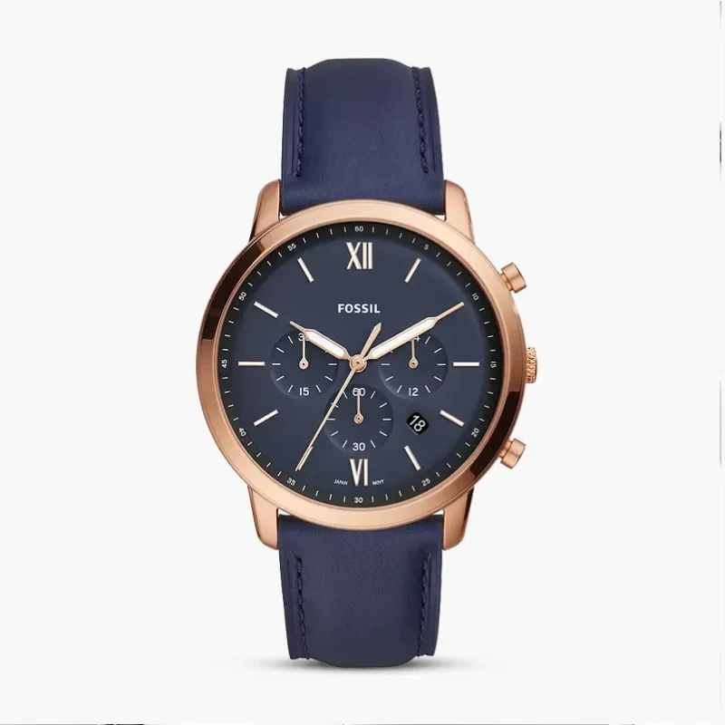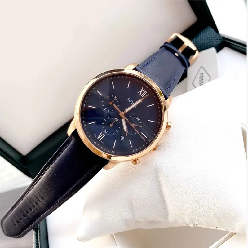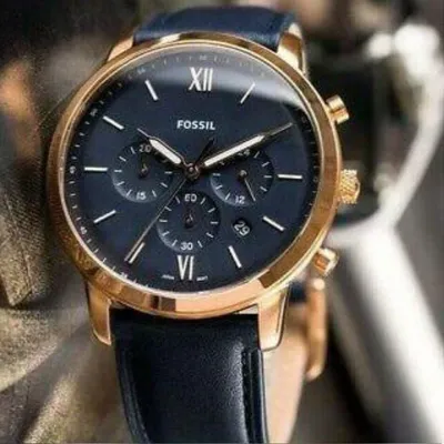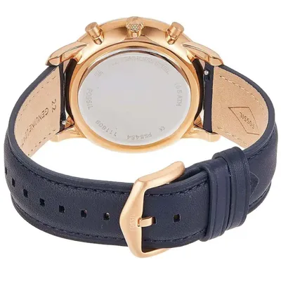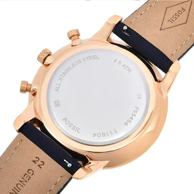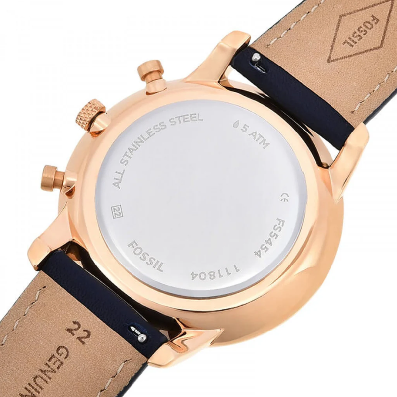 Fossil (FS5454)features an elegant rose-gold bezel and a stylish blue dial. This quartz men's watch delivers the ideal balance of style and functionality with its chronograph capabilities and sturdy stainless steel case.