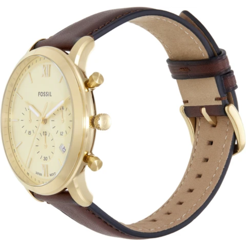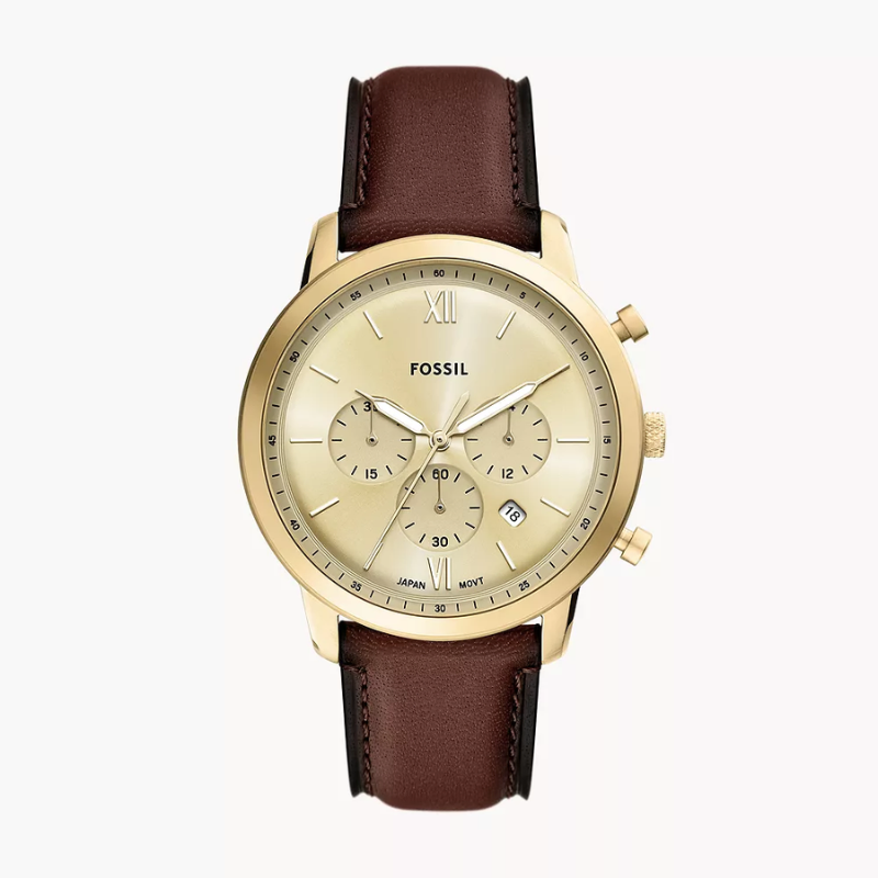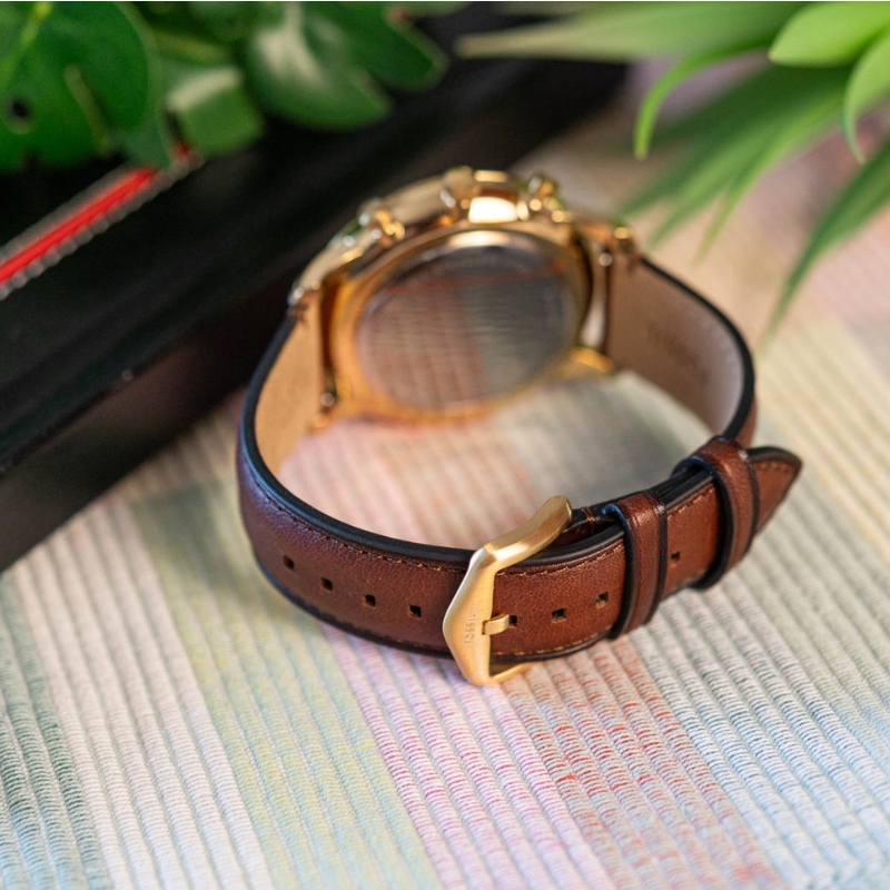 Mid-century inspired Fossil chronograph with champagne sunray dial, gold-tone stainless steel case, domed crystal, and precise Japanese movement—finished with responsibly sourced leather.