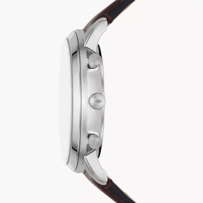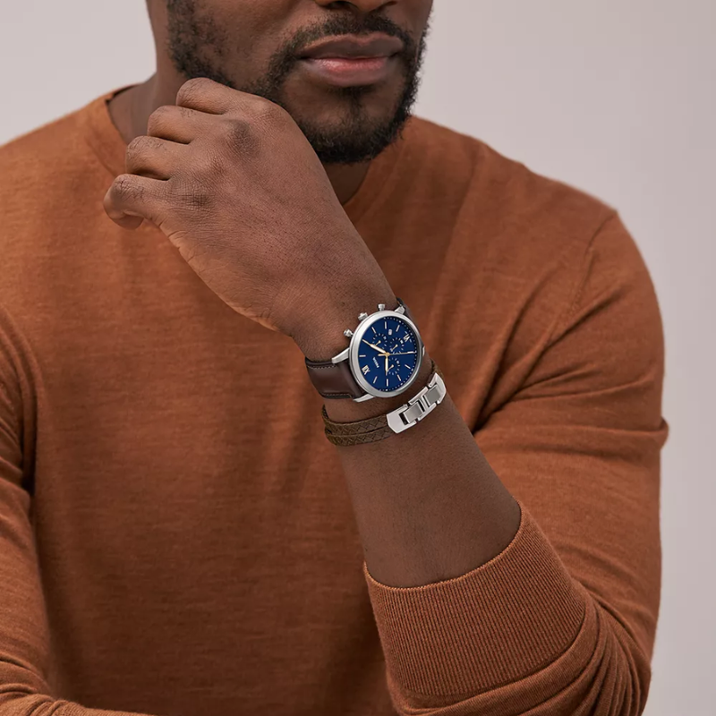 This combo includes a brown leather multi-strand bracelet and a 44mm chronograph timepiece. Through the Leather Working Group, fossil leather goods promote ethical production.