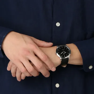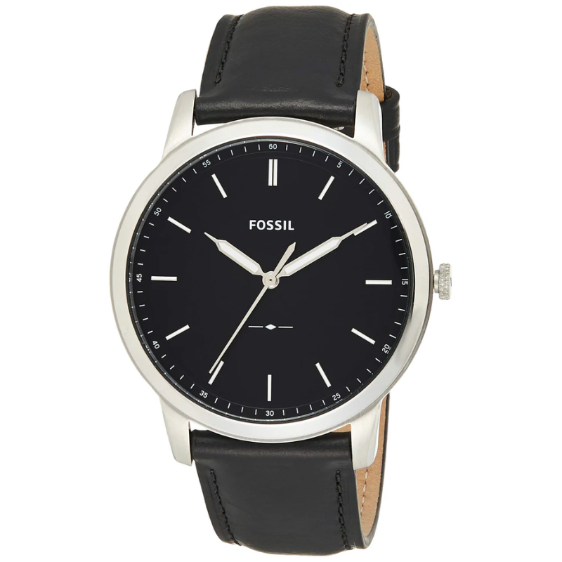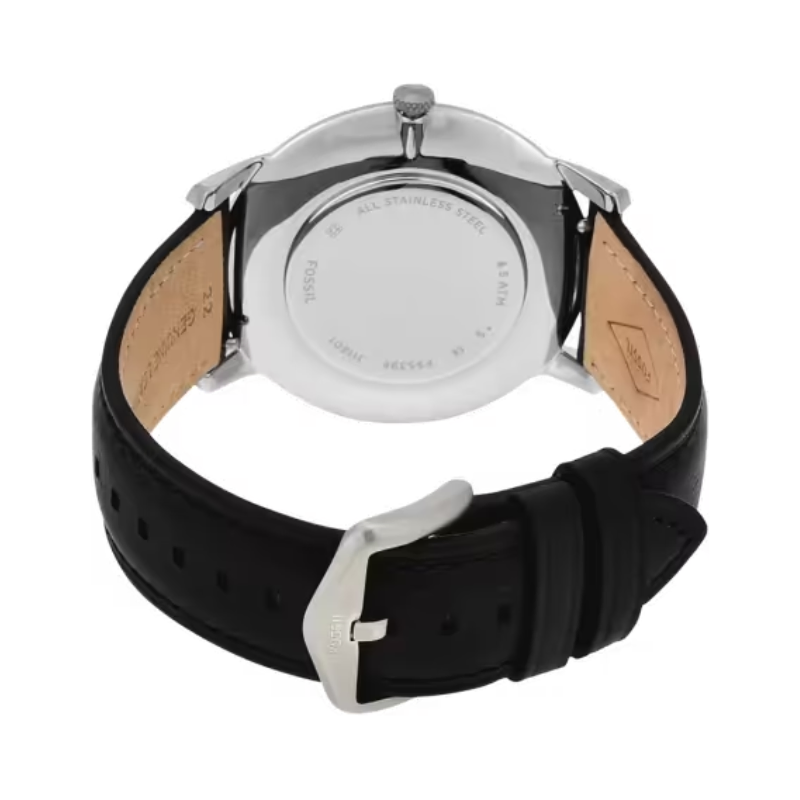 This men's Fossil watch (model FS5398) has a black leather band and a sleek, fashionable black dial. The three-hand feature adds functionality, while the minimalist design provides a timeless appearance. This watch, which is made of high-quality materials, is essential for any modern man.