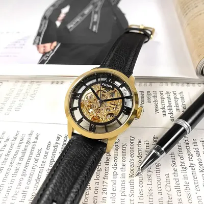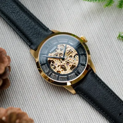 Elevate your look with the Fossil ME3210—an automaticskeleton watch showcasing intricate inner mechanics, a bold gold-tone case, anda premium black leather strap. A perfect fusion of timeless design and modernsophistication