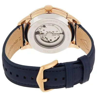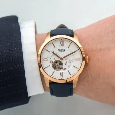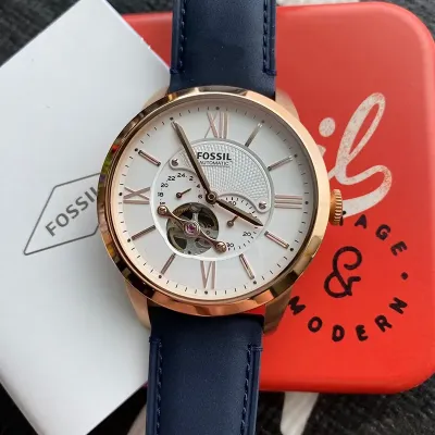 Experience timelesssophistication with the Fossil Townsman ME3171, a masterpiece that blendsclassic design with modern craftsmanship. Featuring an elegant rose gold-tonecase, open-heart dial, and deep navy leather strap, this watch perfectlyreflects the art of precision engineering and effortless style.