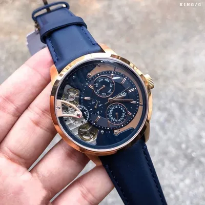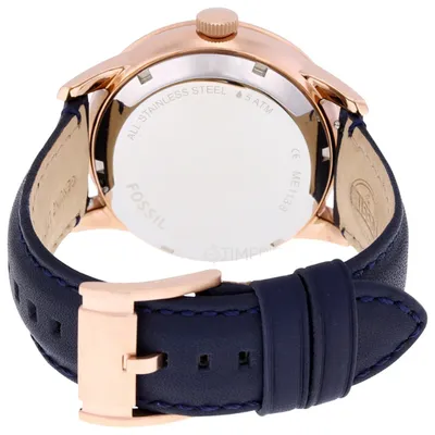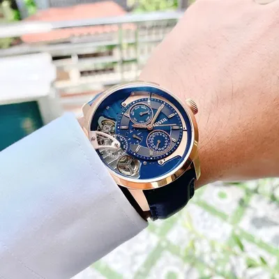 The Fossil ME1138Automatic Watch has a fine blue leather strap, a multifunction chronographdisplay, and an eye-catching blue skeleton dial. This chic watch, whichcombines contemporary sophistication with traditional workmanship, is ideal forboth formal and everyday wear. It is powered by an automatic movement and ishoused in a rose gold-tone stainless steel case.