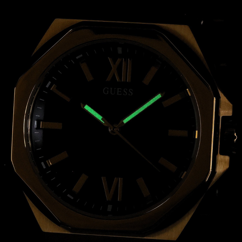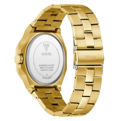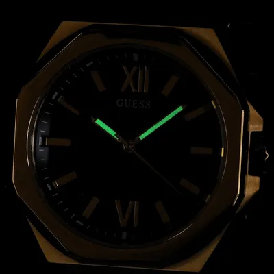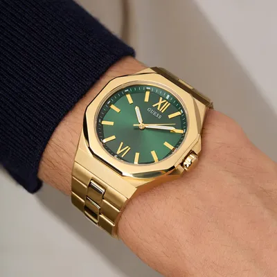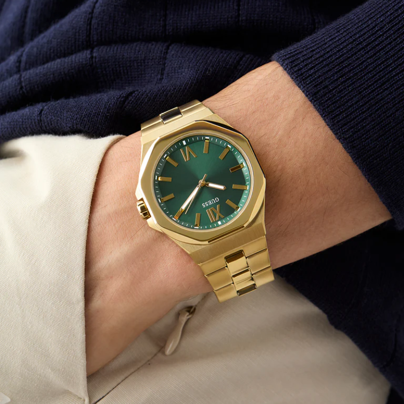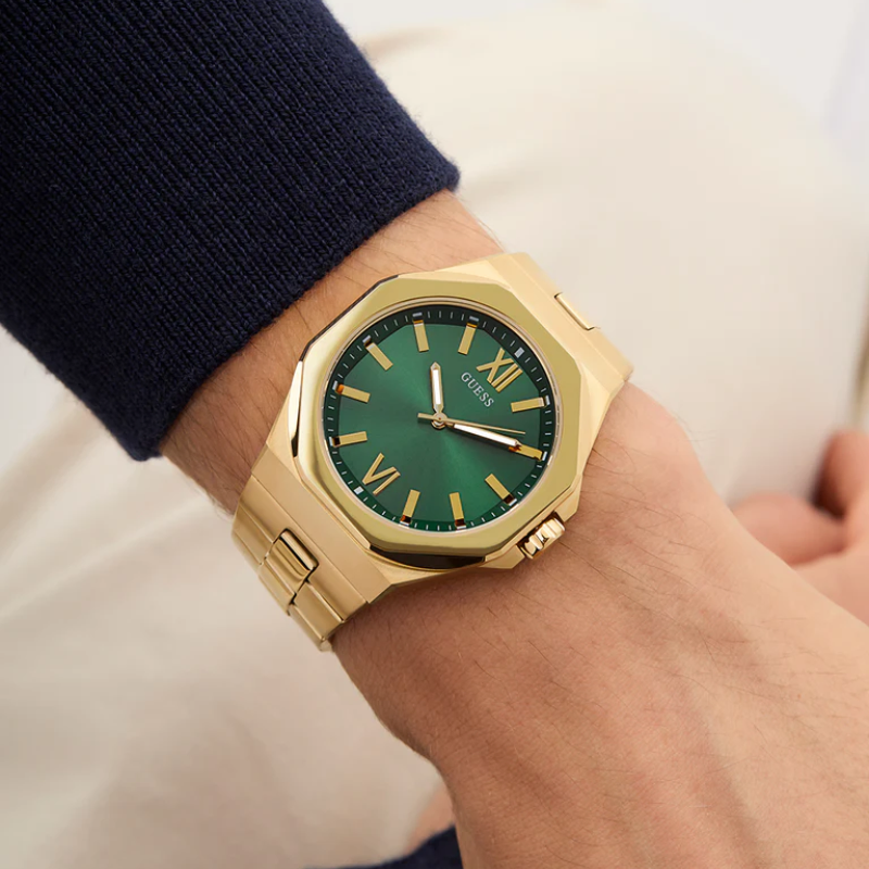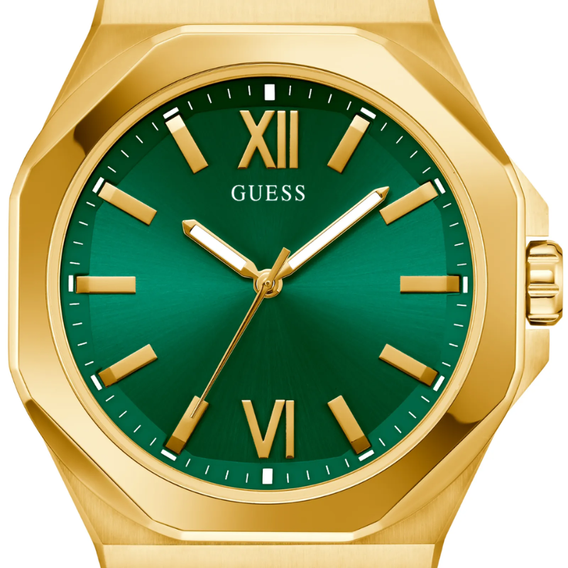Elevate your look with the GUESS GW0849G2, featuring a bold gold-tone stainless steel bracelet and a rich green sunray dial. Designed with a sleek octagonal case, minimalist hour markers, and a stylish Roman numeral finish, this watch delivers a perfect blend of modern fashion and timeless elegance—ideal for both casual and formalwear.