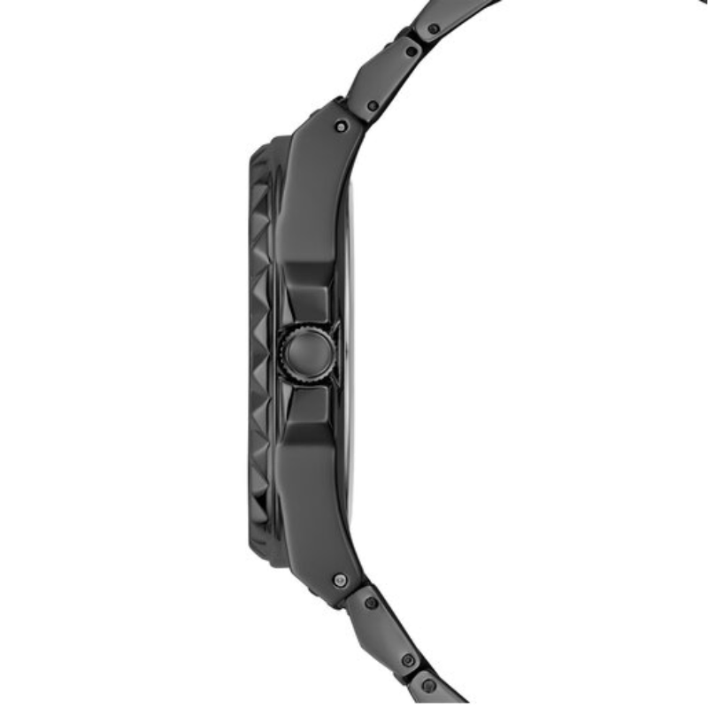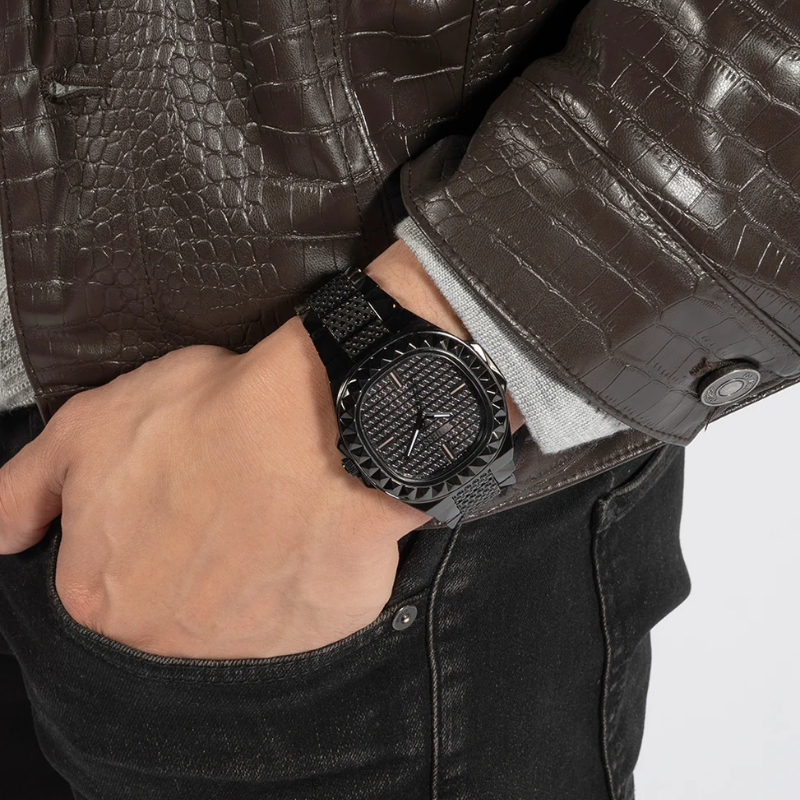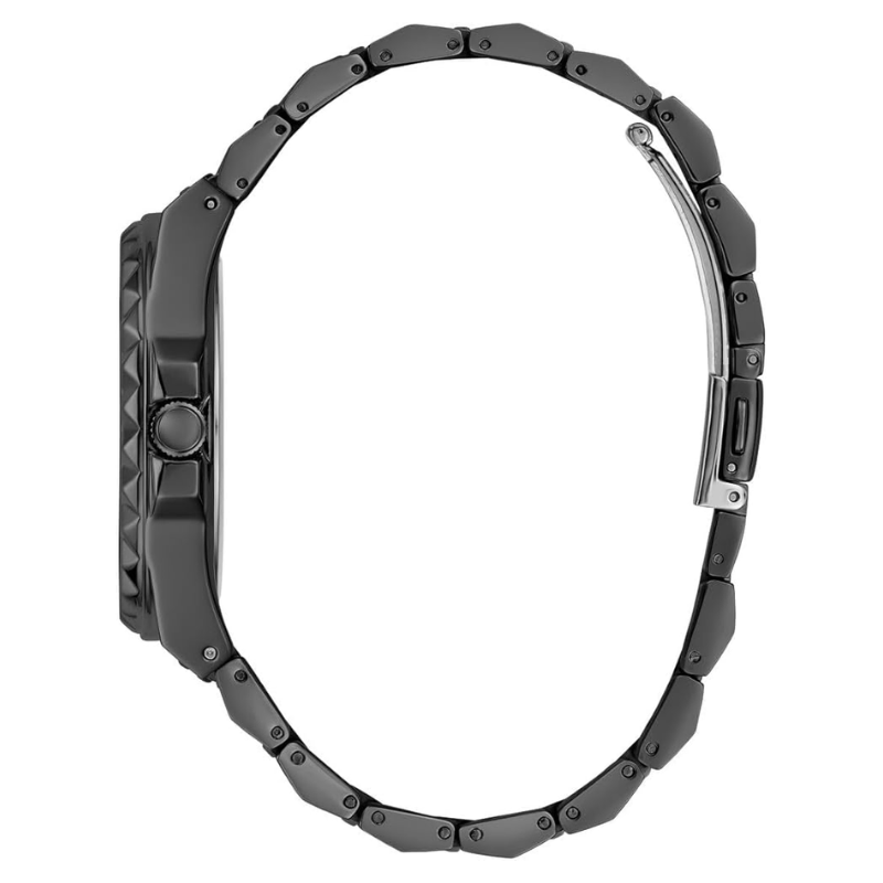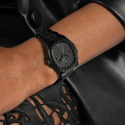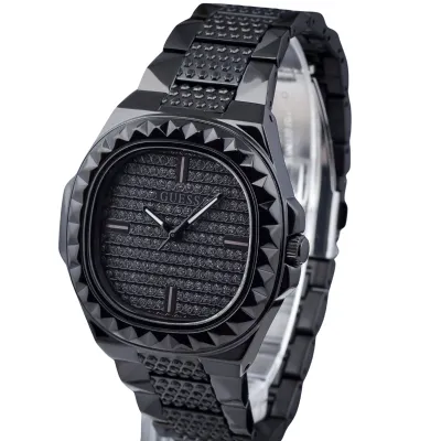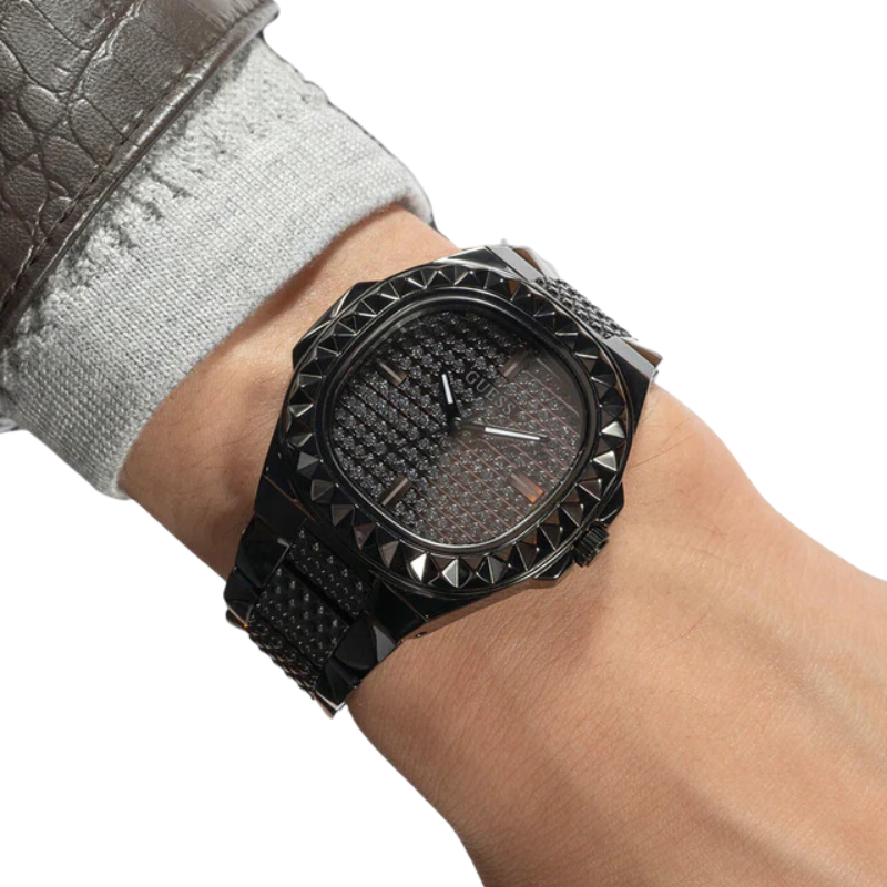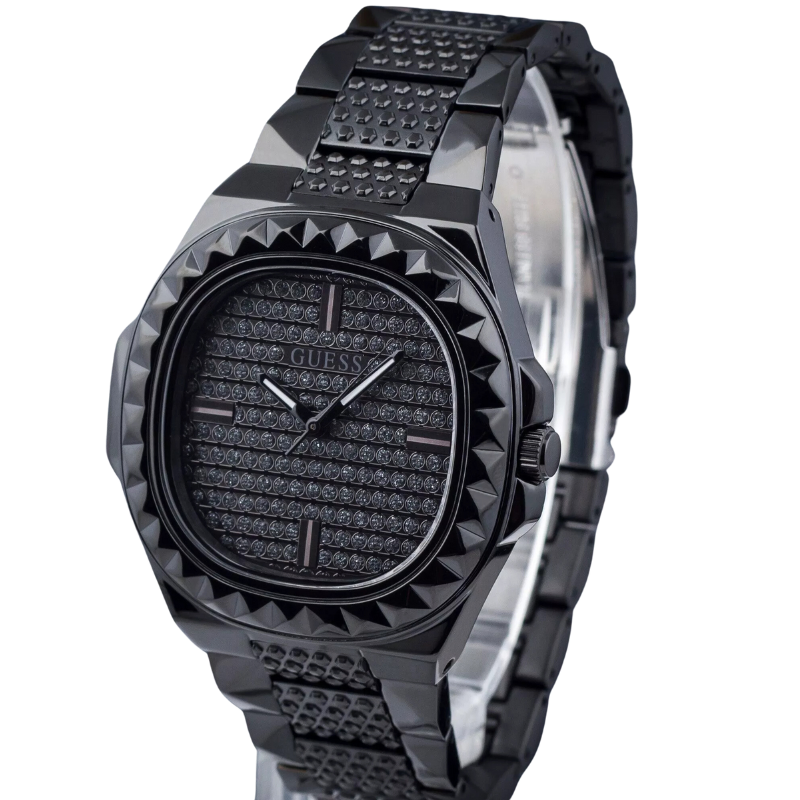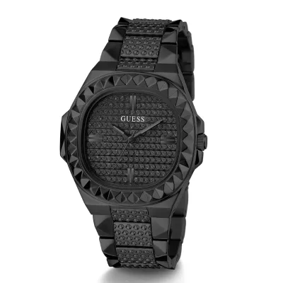 The GuessRebel watch is kept in black colorscheme - this color is used for the stainless steel envelope and bracelet, aswell as the dial, which is additionally decorated with crystals. The dial isprotected by mineral glass. The work of the model is based on a quartzmechanism.