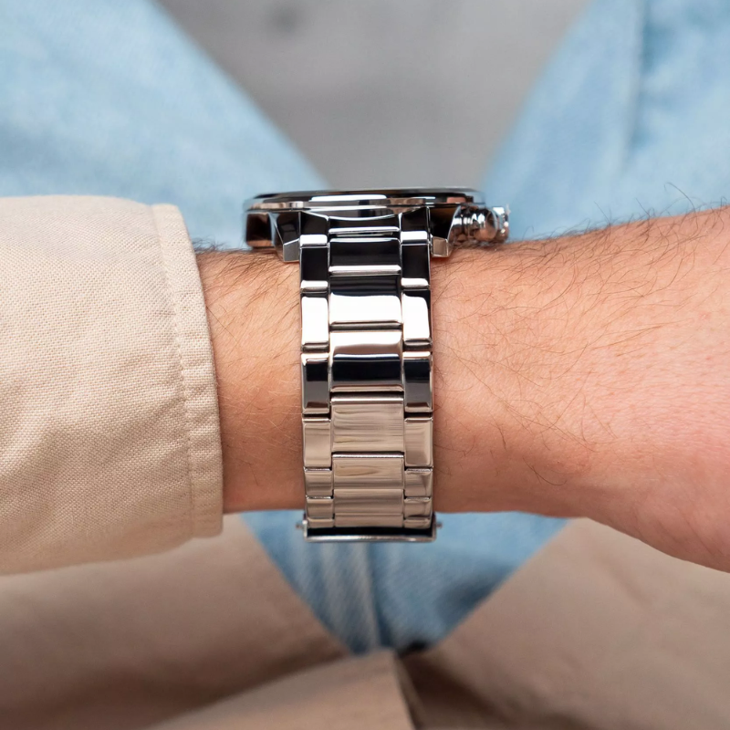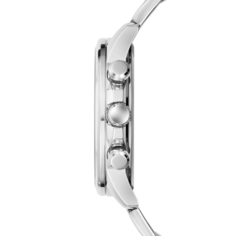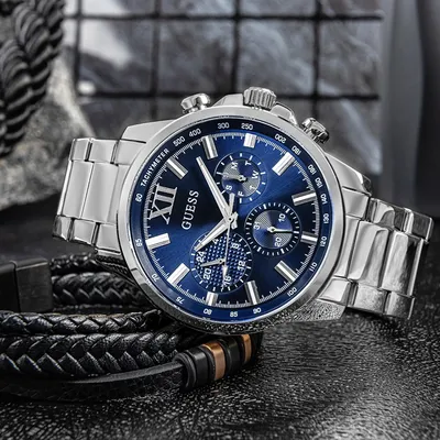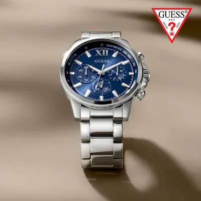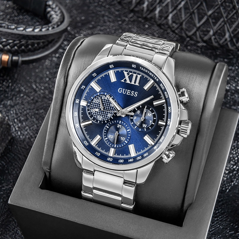 The stylish blue chronograph dial of the GUESS GW0900G4 men's watch is paired with a sturdy silver-tone stainless steel case and strap. This multipurpose watch, which is ideal for both business and daily wear, features a bold, elegant appearance and a dependable quartz movement. It was designed with precision and current elegance in mind.