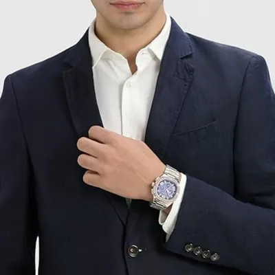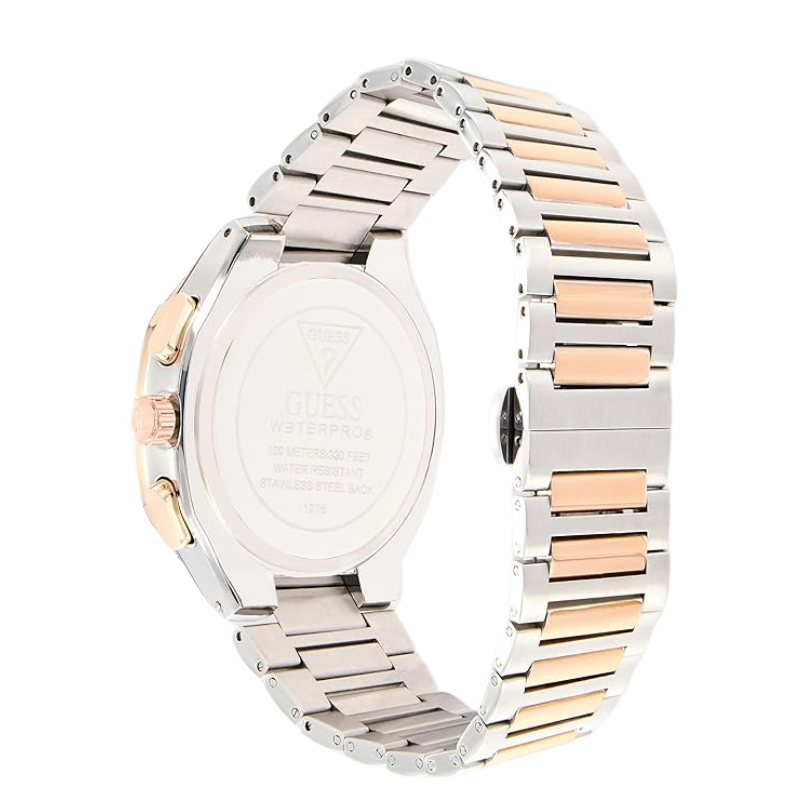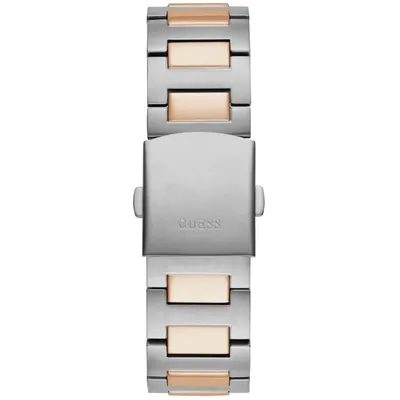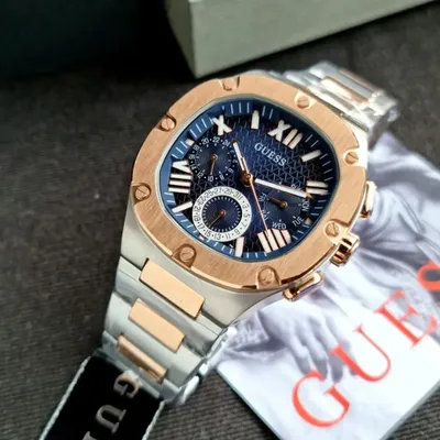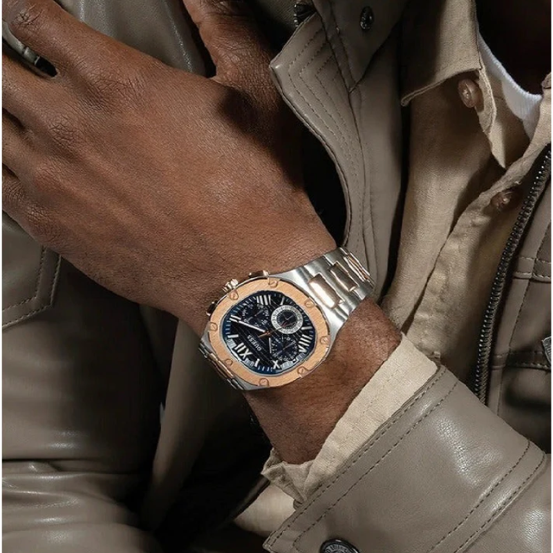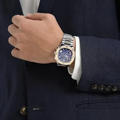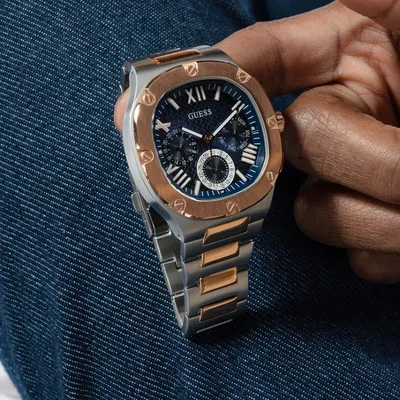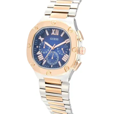 A bold timepiece for the modern man, this multifunction watch is designed with a rose gold-tone case featuring screw details on the rounded square bezel, push buttons on the crown and Roman numeral hour markers on the navy blue dial. Completed by a comfortable silicone strap.