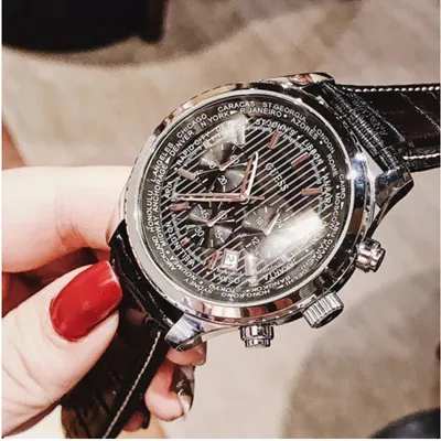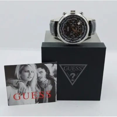The silver steel plate envelope of the Guess Pursuit W0500G2 watch is attached to a black leather belt. The black shield has a chronograph sub-shield, a 24-hourtimepiece, and a dating system for the days of the month. The watch powers the quartz mechanism.